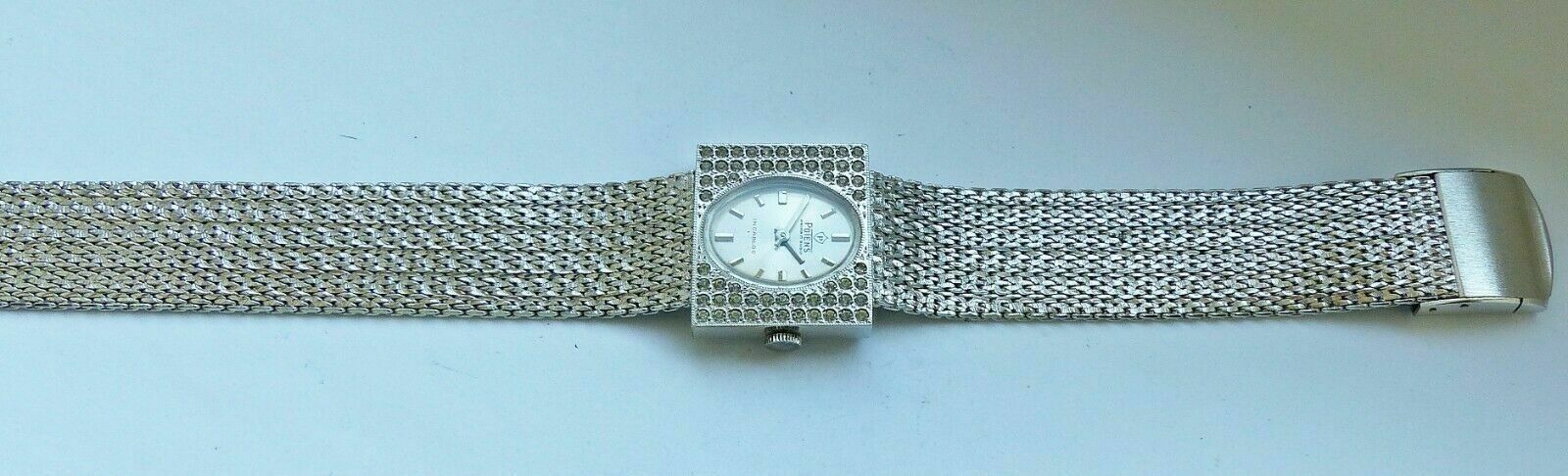 Hersteller : Potens Schweiz Modell Quadrante mit Silbernem Zifferblatt und aufgesetzten Strichindexen, Lünette mit 60 echten Zirkonia Steinchen Uhrwerk : Kaliber Felsa Swiss 2144 Handaufzug mit 17 Jewels Material Gehäuse : Komplett in Edelstahl poliert Durchmesser Gehäuse : 25mm x 23mm x 7mm Armband