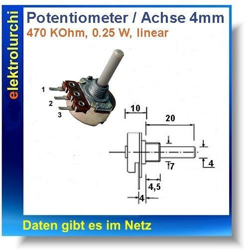 Potentiometer 470K Ohm , 0,25Watt, linear, Achse 4mm, Kunststoff, Poti, 1St.
