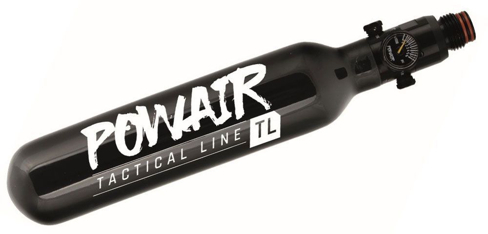 PowAir TACTICAL Line Composite HP System mit einem Füllvolumen von 16ci 0,25L und einem Arbeitsdruck von 300 Bar 4500 PSI. Die Flasche ist mit einem PowAir MaxReg Regulator ausgestattet. Dieser ist im Ausgangsdruck verstellbar und bietet serienmäßig einige interessante Features wie doppelte O-Ringe,