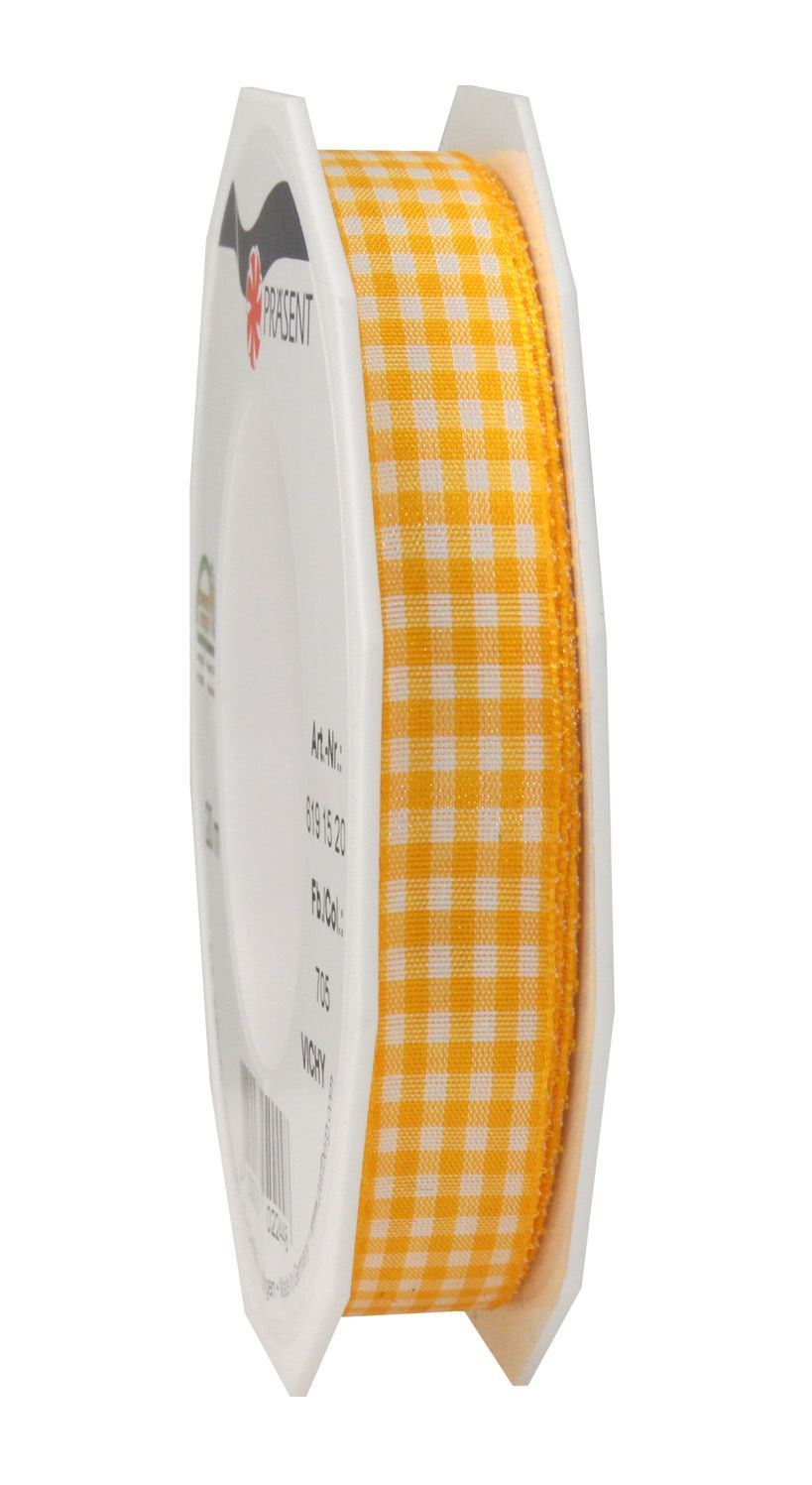 Präsent Motivband Karo Vichy 20-m-Rolle 15 mm sonnengelb/ weiss