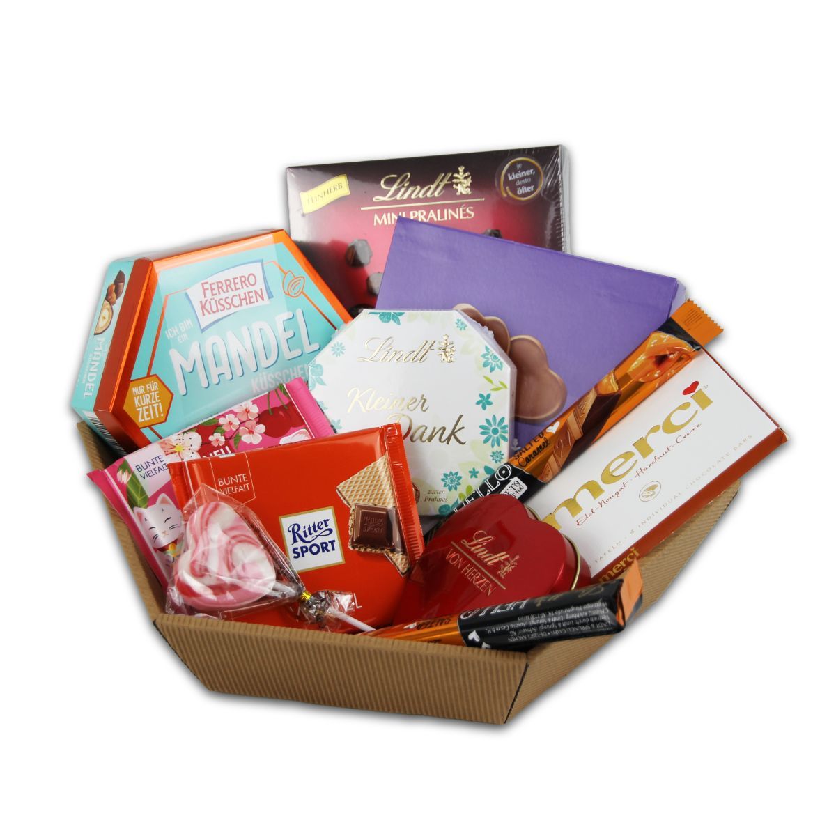 Zutaten: MILCHSCHOKOLADE 30 % (Zucker, Kakaobutter, Kakaomasse,MAGERMILCHPULVER, BUTTERREINFETT, Emulgator Lecithine (SOJA), Vanillin), HASELNÜSSE (28,5 %), Zucker, Palmöl, WEIZENMEHL, SÜSSMOLKENPULVER, fettarmer Kakao,Emulgator Lecithine (SOJA), BacktriebmittelNatriumhydrogencarbonat, Salz, Vanillin. Zutaten: Zucker, Kakaobutter, Palmöl, Kakaomasse, Süßmolkenpulver (aus MILCH), MAGERMILCHPULVER, BUTTERREINFETT, HASELNUSSMASSE (2 %), Emulgatoren (SOJALECITHIN, E476, Sonnenblumenlecithin), Aromen (enthalten MILCH). KANN ANDERE NÜSSE UND WEIZEN ENTHALTEN. Zutaten: Halbbitterschokolade 49 % (Zucker, Kakaomasse, Kakaobutter, EmulgatorLecithine (SOJA), Vanillin), Zucker, Kirsche (18 %), Likör 13 %(Glukosesirup, Wasser, Alkohol, Zucker, Aromen), Kakaobutter.Kann MILCHBESTANDTEILE enthalten.Zutaten: Zucker, Kakaomasse, Kakaobutter, VollMILCHpulver, MANDELN, Glukose-Fruktose-Sirup, Marc de Champagne, BUTTERreinfett, Invertzucker, Orangenschalen, Zitronenschalen, KondensMILCH, MagerMILCHpulver, MILCHzucker, Alkohol, HASELNÜSSE, Emulgator (SOJAlecithin), Aromen, Feuchthaltemittel (Invertase), GERSTENmalzextrakt, Zitronensaftkonzentrat, Orangenöl. Kann andere SCHALENFRÜCHTE enthalten. : Zucker, Kakaomasse, Kakaobutter, SAHNEpulver, MILCHzucker, MagerMILCHpulver, Emulgator: Lecithine (SOJA). Zutaten: Zucker, Kakaobutter, Kakaomasse, VollMILCHpulver, MANDELN, HASELNÜSSE, Glukose-Fruktose-Sirup, BUTTERreinfett, Traubenzucker, PISTAZIEN, MagerMILCHpulver, KondensMILCH, Invertzucker, Zitronenschalen, Orangenschalen, Palmöl, Marc de Champagne, MILCHzucker, Kirschwasser, Emulgator (SOJAlecithin), Alkohol, SAHNEpulver, Kaffee, Orangensaftkonzentrat, natürliches Aroma, Feuchthaltemittel (Invertase), GERSTENmalzextrakt, Aromen, Zitronensaftkonzentrat, fettarmes Kakaopulver, Überzugsmittel (Gummi arabicum). Kann andere SCHALENFRÜCHTE enthalten. Lindt Riegel Zutaten: Zucker, VollMILCHpulver, Kakaobutter, HASELNÜSSE (12%), Kakaomasse, MagerMILCHpulver, BUTTERreinfett, WEIZENmehl, Emulgator (SOJAlecithin), MILCHzucker, Palmöl, Salz, Aroma Vanillin, Karamellzuckersirup. Kann andere SCHALENFRÜCHTE enthalten. Herz Lolly Zutaten: Zucker, Glukosesirup (Mais), Wasser, Säuerungsmittel (E330), Aroma, Farbstoffe (E129*).