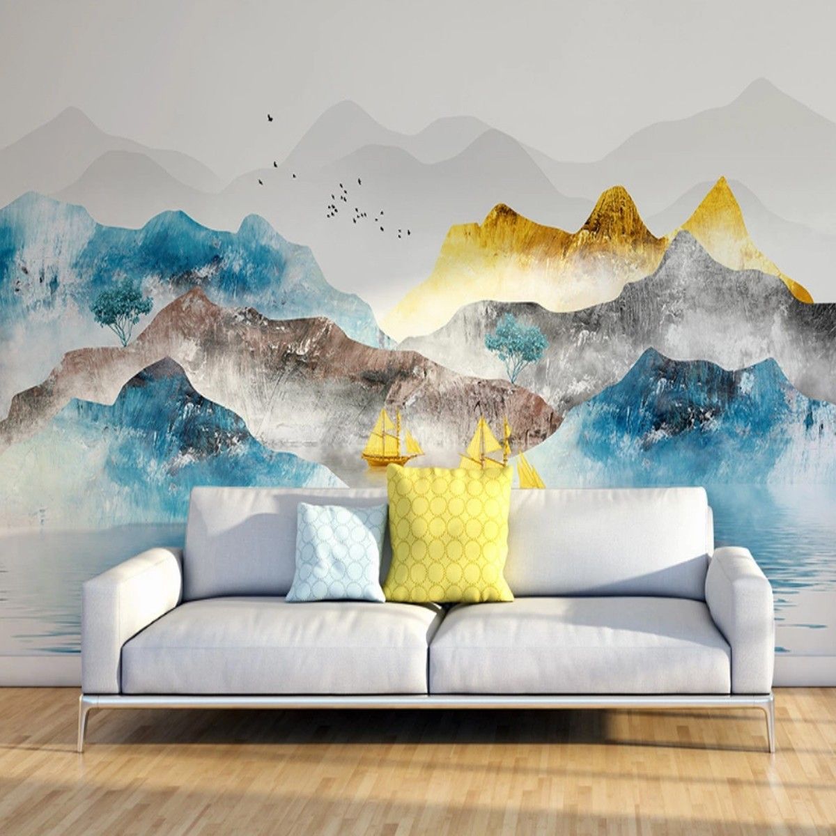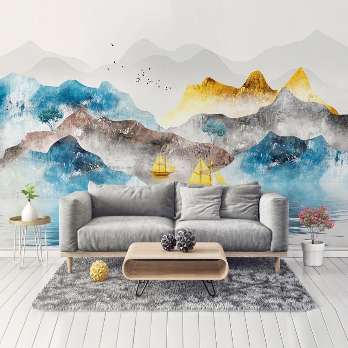 Premium 3D Wandtapete Kunst Gold Berg & Fluss Wohnzimmer Tapete 10319