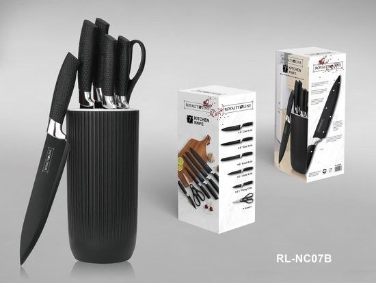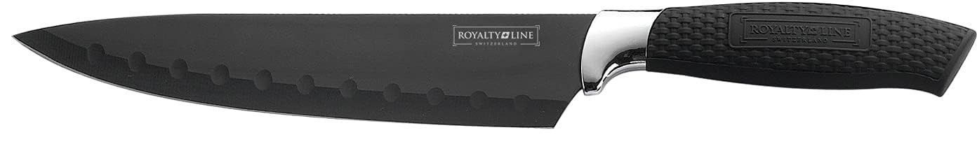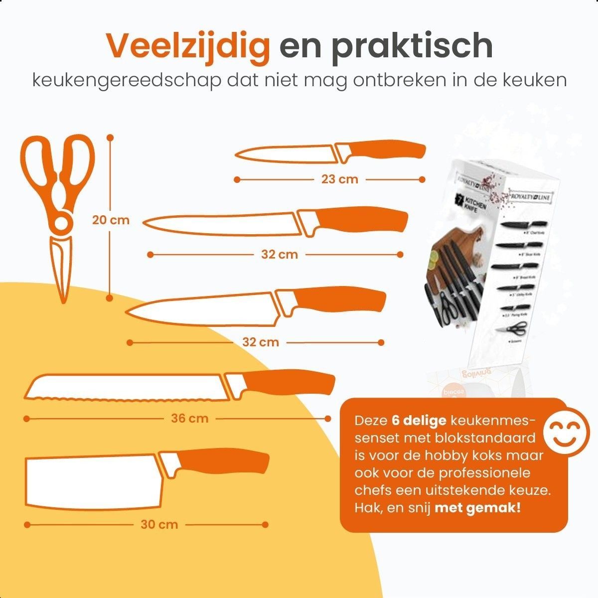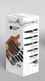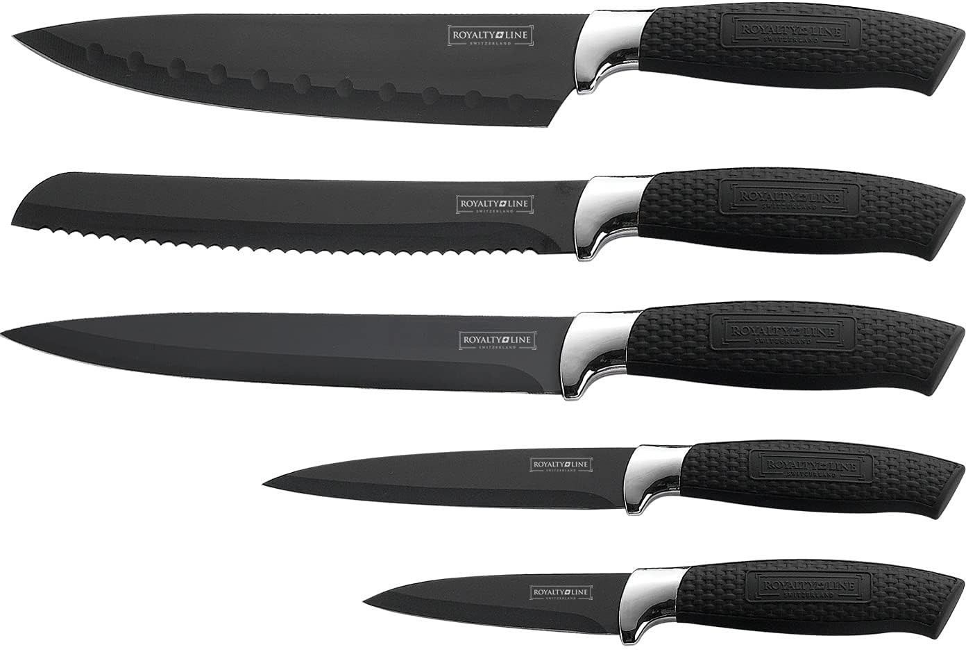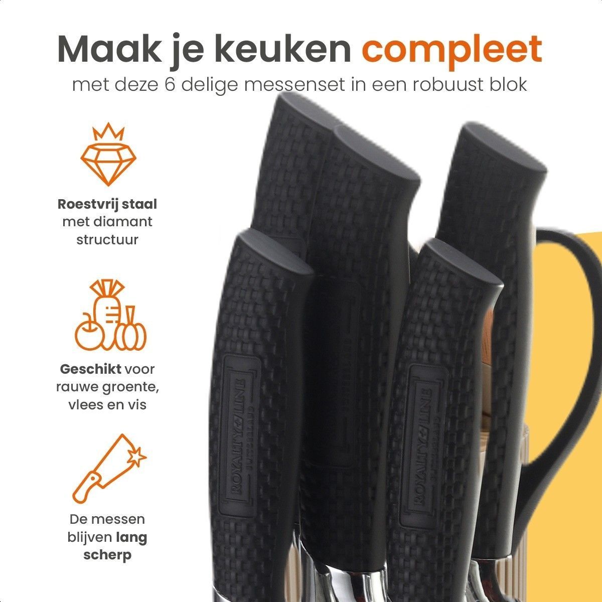 Royalty Line 7-teiliges Premium-Messerset: 20 cm Koch-, Tranchier- & Brotmesser, 13 cm Allzweckmesser, 9 cm Schälmesser, Küchenschere & stilvoller Holz-Messerblock. Rostfreie Edelstahlklingen für dauerhafte Schärfe, ergonomische Griffe für sicheren Halt. Der kompakte Block ermöglicht platzsparende, sichere Aufbewahrung. Ideal für Hobby- und Profiköche – alles, was Sie für präzises Schneiden benötigen.