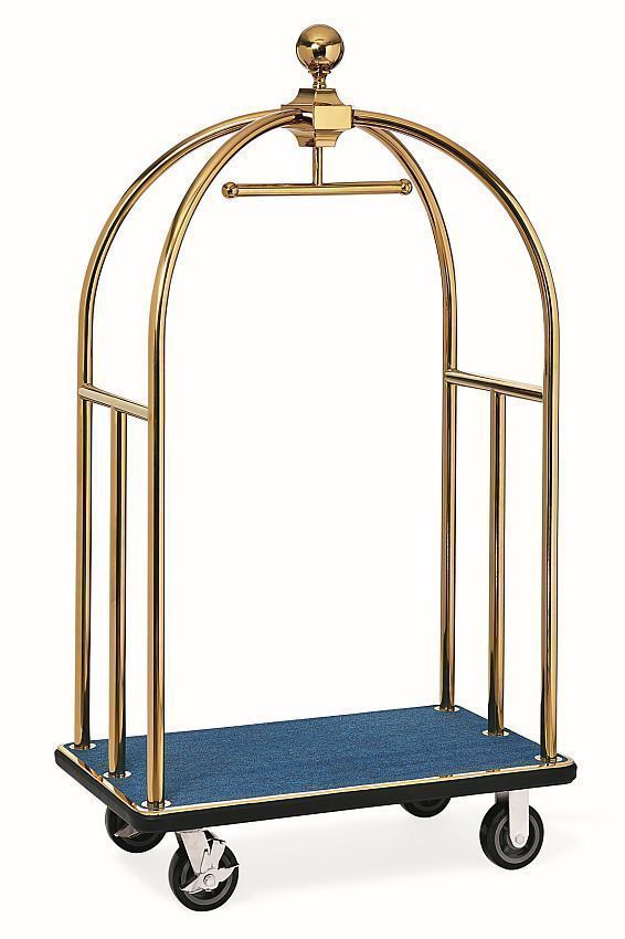 • Gepäckwagen für hohe Belastung • goldfarben, galvanisch veredelt • Rohrrahmen aus Ø 38 mm Edelstahl • mit integrierter Garderobenstange • mit 4 stabilen Rädern mit Ø 150 mm, davon 2 lenkbar und mit Feststellbremse • Bodenauslage aus strapazierfähigem und kofferschonenden Gewebe in blau • mit umlaufenden Stoßprofil aus Gummi • der Gepäckwagen wir demontiert zur Selbstmontage geliefert • Gewicht: 31 kg