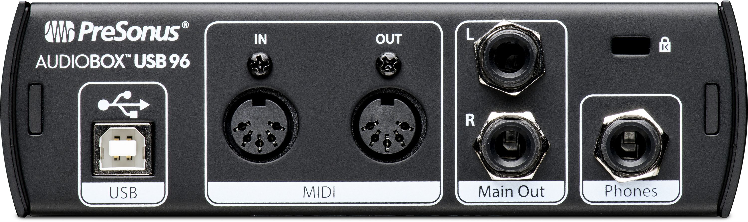 Presonus AudioBox USB 96 25th Anniversary 25th Anniversary Edition 2 Mic Instrument Eingänge: XLR Combobuchse 2 Line-Ausgänge: 6,3 mm Klinke symmetrisch MIDI Ein- und Ausgang Stereo Kopfhörerausgang: 6,3 mm Klinke USB 2.0 Anschluss +48V Phantomspeisung zuschaltbar 2 Gain-Regler und Clip-LED pro Kana