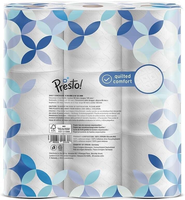 Presto! Toilettenpapier Klopapier 3-lagig Vorratspack 36 Rollen 36 x 200 Blätter
