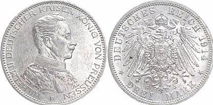 Preussen 3 Mark Silber Wilhelm II. in Kürassier - Uniform 1914 A, J. 29, vz