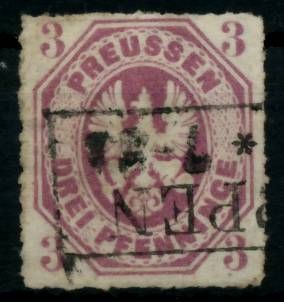 PREUSSEN Nr 19a gestempelt 3 Pf, Adler im Achteck, durchstochen 11 3 4, lila 20.80€ incl. MwSt: Differenzbesteuert zzgl. Versandkosten Bestell-Nr.: 6C1C6A Katalog-Nr: MICHEL (19 a) Katalogpreis: 55 EUR Qualität: Normal Erhaltung: Rundstempel (Datum Ort) Einheit: Einzelmarke Einzelstück Bogenlag