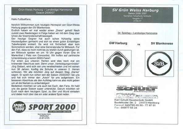 Fußball-Programm (Stadionheft programme program programma Matchprogramm Stadionzeitung) zum Spiel in der Hamburger Landesliga Hammonia (Hamburg - Deutschland GERMANY Allemagne) SV Grün-Weiß Harburg (GW) vs SV Blankenese (SVB) am 25. 6. 2007 am Sportplatz Scharfsche Schlucht (Format A5, inkl. Cover u