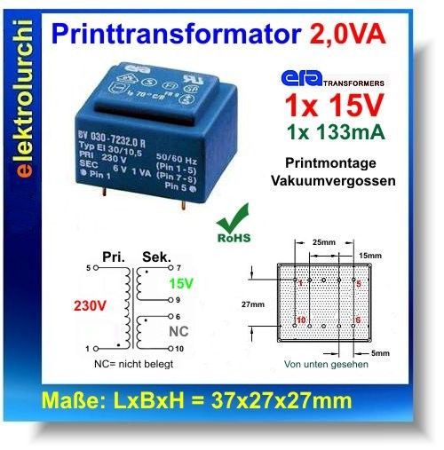 Print Tansformator Trafo, pri. 230V, sek.1 x 15V, 1 x 133mA, 2,0VA, Era EI30/15,5,1St