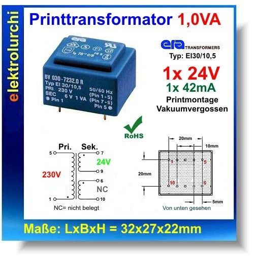 Print Tansformator, Trafo, pri. 230V, sek.1 x 24V, 1 x 42mA, 1,0VA, Era EI30/10,5,1St