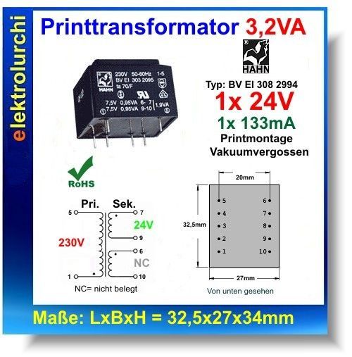 Print Transformator Trafo pri. 230V, sek.1 x 24V, 1 x 133mA, 3,2VA, Hahn EI3062994