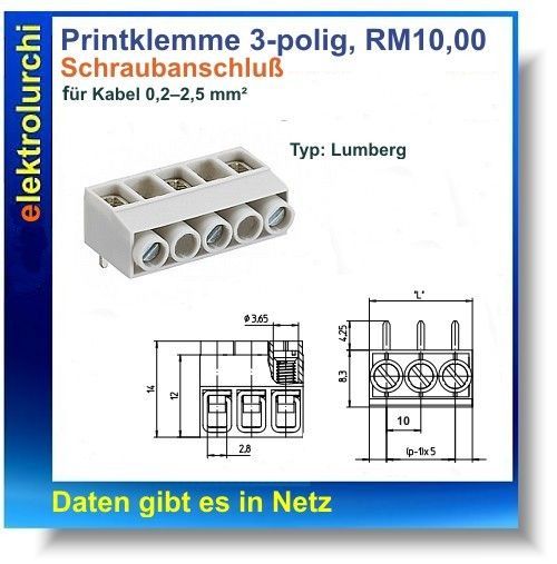 Sie bieten hier auf folgenden Artikel 1 Stück Printklemme 3-polig, 1-reihig gerade RM 10mm h=9,3mm, Lumberg Serie 6324, Polzahl: 3 Rastermaß: 10,00mm Höhe: 9,3mm Anschluss: Printmontage Schraubanschluss: bis von 0,5 - 2,,5 mm mehrdrähtig Nennstrom 10A Nennspannung 300VAC Schrauben mit Drahtschutz (L