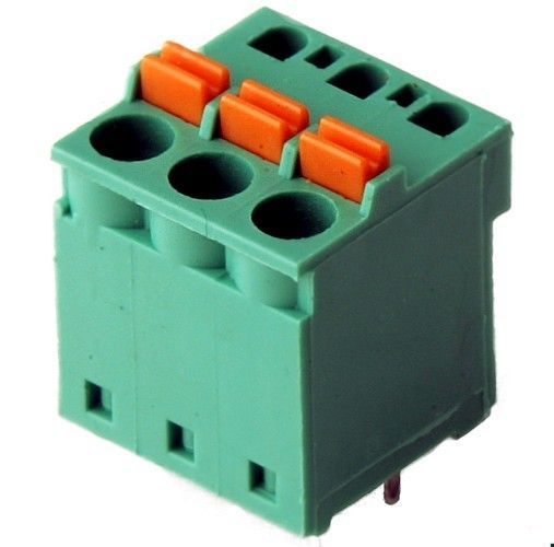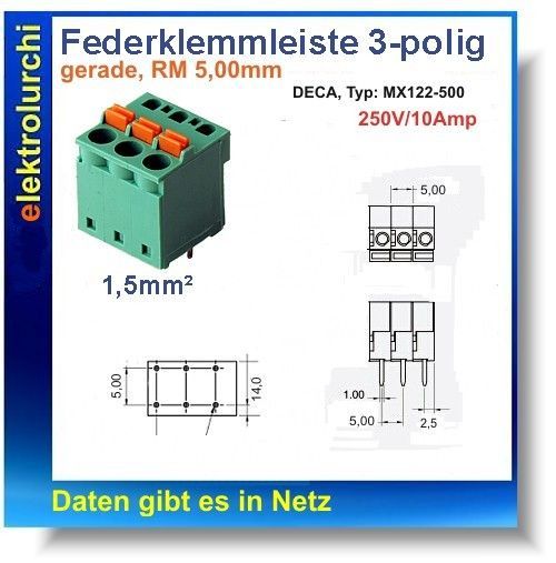 Sie bieten hier auf folgenden Artikel 1 Stück Printklemme Federklemmleiste 3-polig, RM5,00 DECA Typ MX122-500 Klemmleiste Doppellötstift für hohe Standfestigkeit auf der Leiterplatte Push-in-Direktstecktechnik für starre oder flexible Leiter mit oder ohne Aderendhülse Details: Nennstrom: 10 A Nennsp