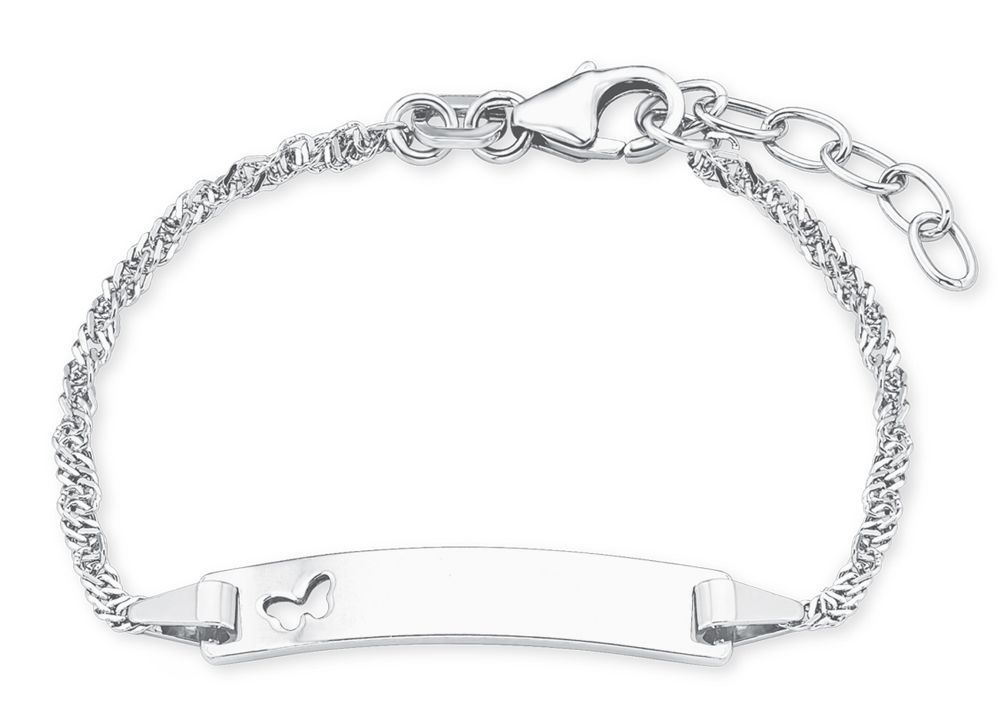 Längenverstellbares Ident-Armband aus rhodiniertem 925er Sterling Silber, an der feinen Armkette verzaubert die Gravurplatte mit einem ausgestanzten Schmetterling die kleinen Prinzessinnen, mit einer individuellen Gravur ist der Armschmuck immerzu einzigartig und ziert das Outfit einmalig