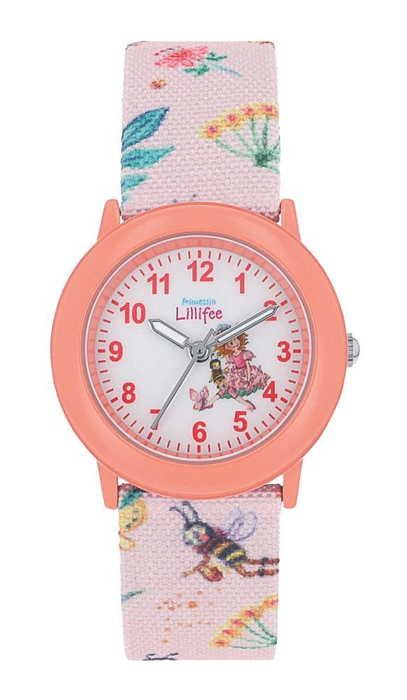 Das schlichte und mit Prinzessin Lillifee gestaltete Zifferblatt erleichtert das Ablesen der Uhrzeit. Diese Uhr hat ein weiches, anschmiegsames Textilarmband mit Edelstahl-Dornschließe und Bienen-Blumen-Motiv. Das Gehäuse besteht aus mattiertem orange eloxierten Aluminium und ist dadurch angenehm leicht. Der Gehäuseboden ist aus Edelstahl gefertigt.