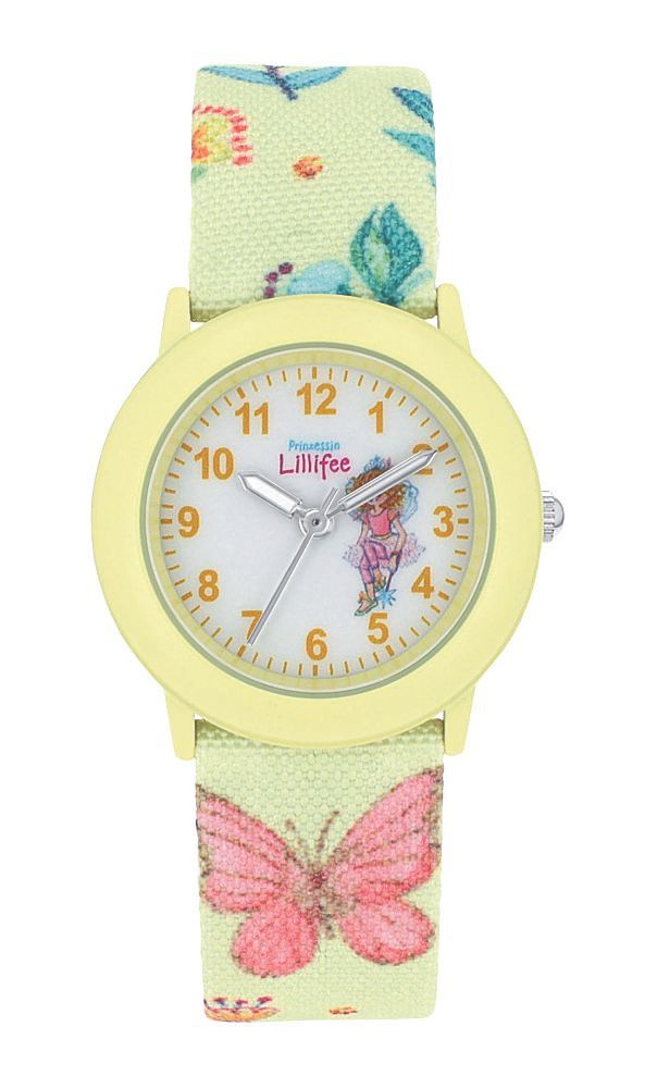 Das schlichte und mit Prinzessin Lillifee gestaltete Zifferblatt erleichtert das Ablesen der Uhrzeit. Diese Uhr hat ein weiches, anschmiegsames Textilarmband mit Edelstahl-Dornschließe und bunten Schmetterlingen. Das Gehäuse besteht aus mattiertem gelb eloxierten Aluminium und ist dadurch angenehm leicht. Der Gehäuseboden ist aus Edelstahl gefertigt.