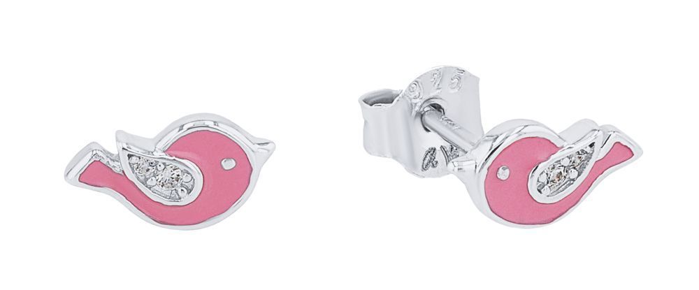 süße Vogel Ohrstecker, rosa Email verziert mit funkelnden Zirkonia (syn.), 925 Sterlingsilber, anlaufgeschützt durch hochwertige Rhodiumbeschichtung