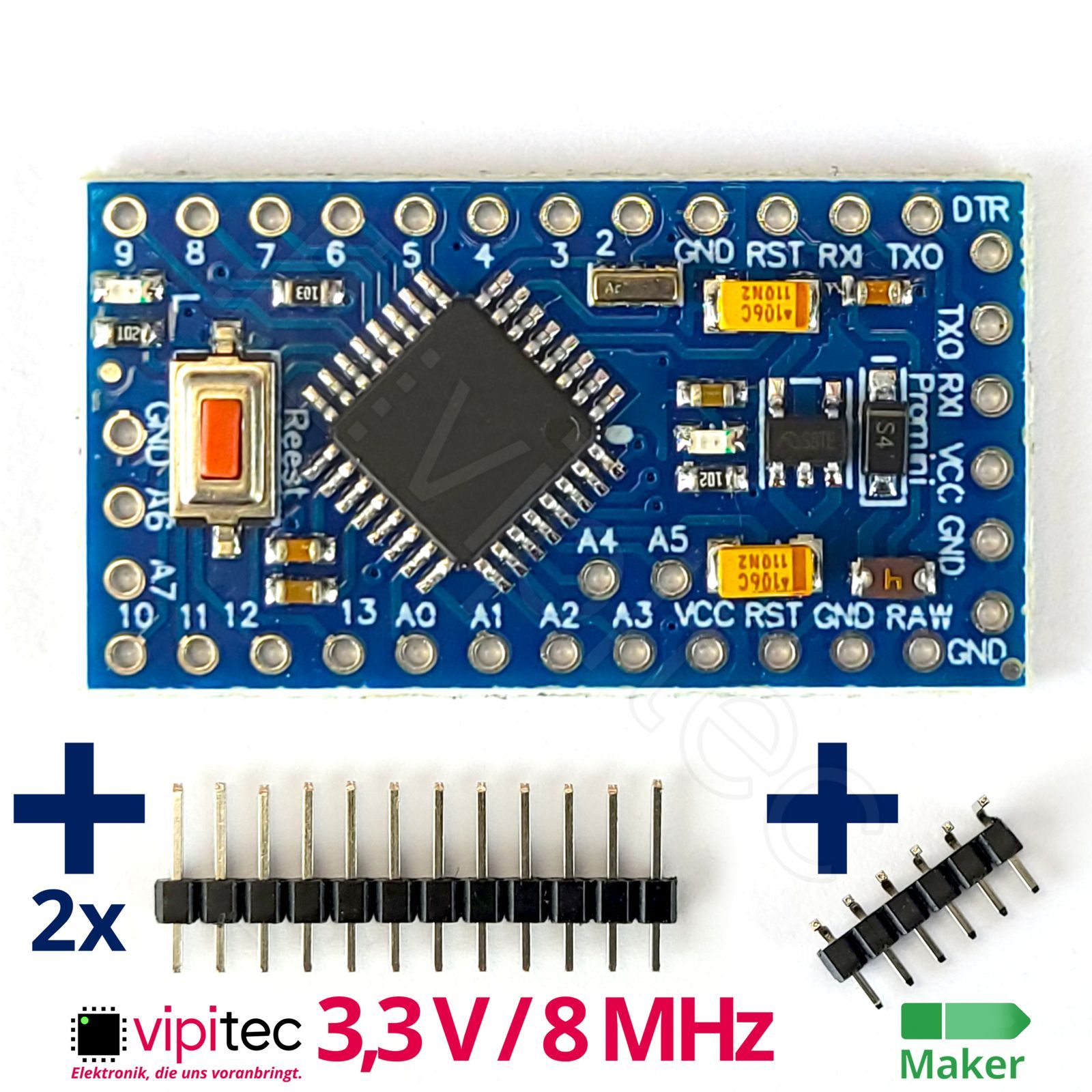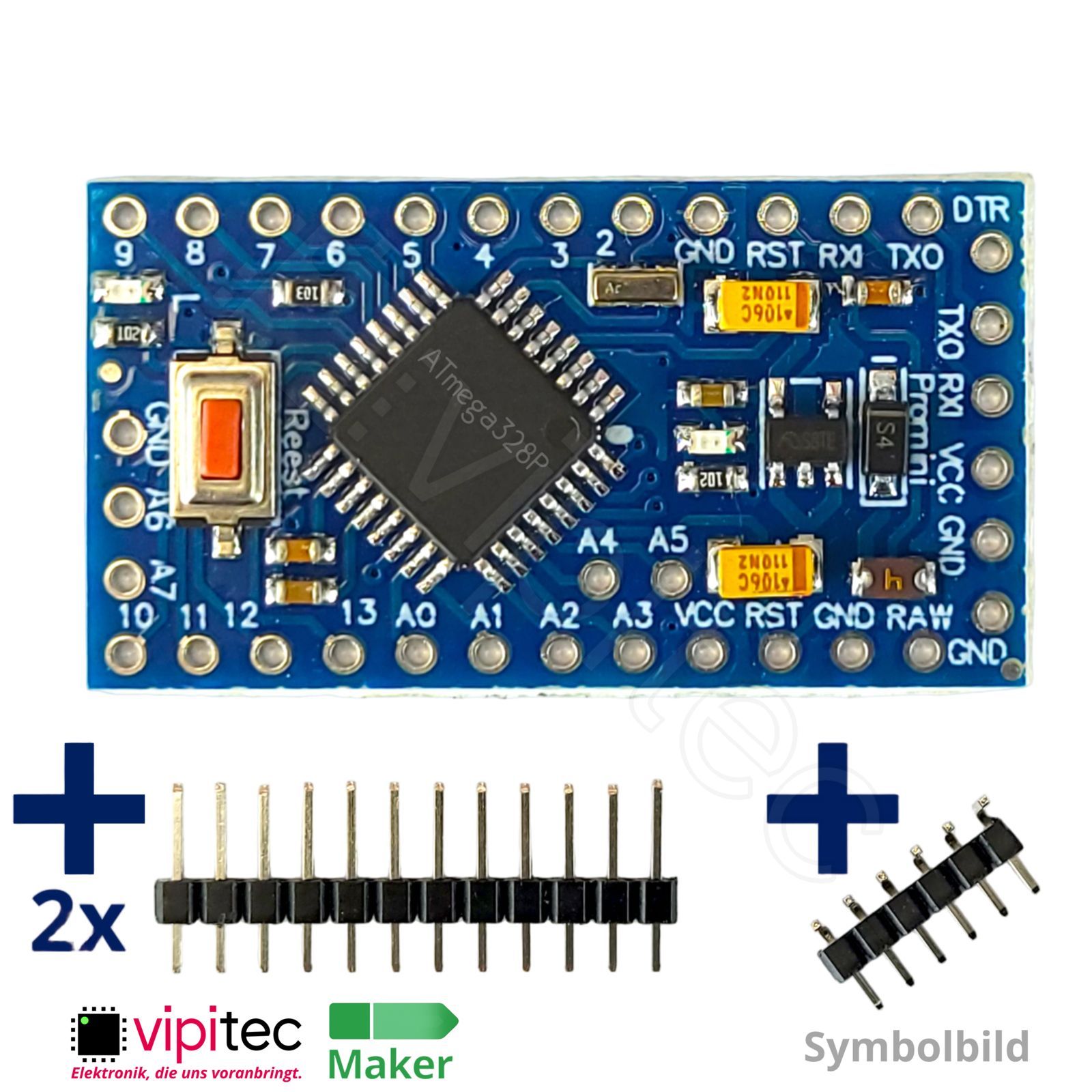 Warenkorb vipitec Shop Aktuelle Angebote Kontakt Komponenten > Entwicklungsplatinen Pro Mini Ent& 173;wicklungs& 173;board mit Arduino& 174;-kompatiblem Bootloader Spezifikation: 3,3 V mit 8 MHz oder 5 V mit 16 MHz, ATmega328P, 13 Digital-I Os, 6 Analog-Pins, 6 PWM-Ports In unserem Shop finden Si