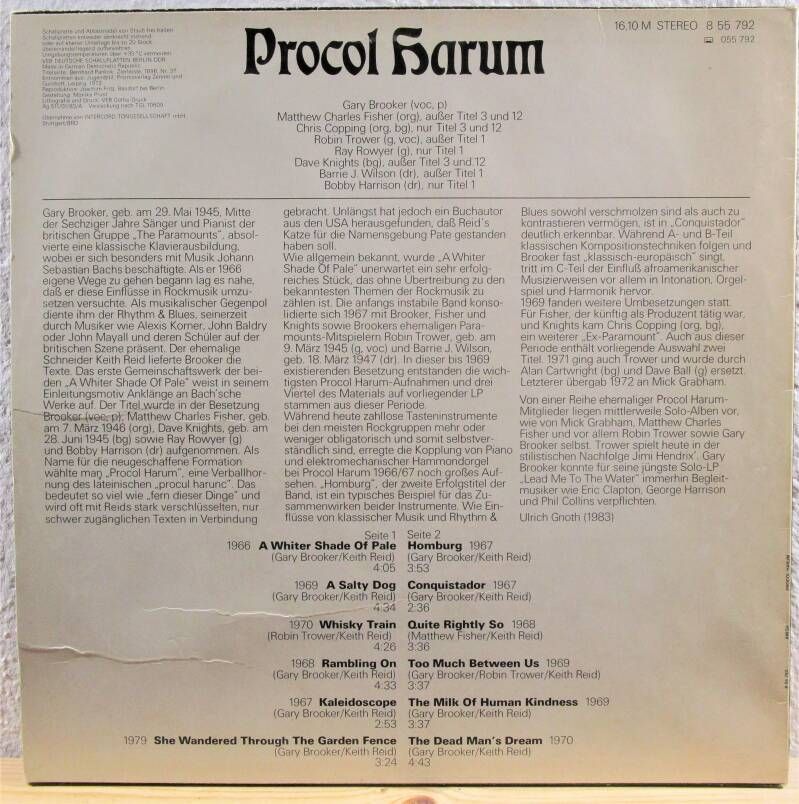 Procol Harum Amiga 8 55 792 1983 Vinyl: VG++ Cover: VG A1 A Whiter Shade Of Pale 4:05 A2 A Salty Dog4:34 A3 Whisky Train 4:26 A4Rambling On 4:33 A5 Kaleidoscope 2:53 A6 She Wandered Through The Garden Fence 3:24 B1 Homburg 3:53 B2 Conquistador 2:36 B3 Quite Rightly So 3:36 B4 Too Much Between Us 3:3