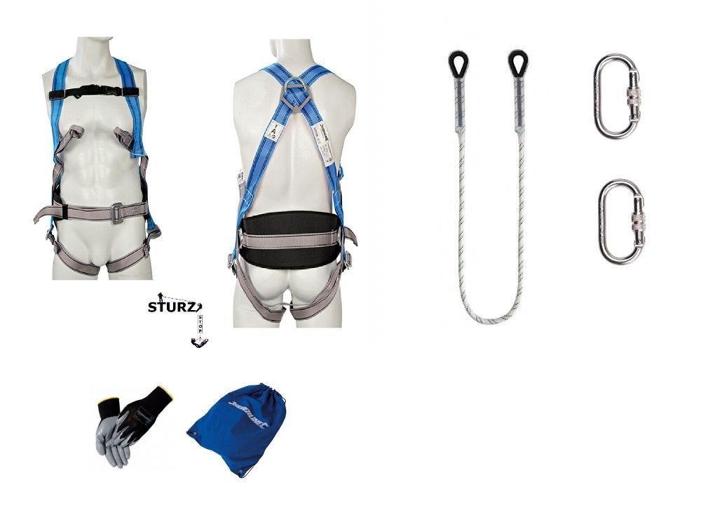 Profi Auffangsystem Set 2in1 < font > nach DIN EN361 < font > 4-Punkt Ganzkörper-Auffanggurt inkl. < font > Profi Halteseil 2m mit 2 Karabinern < font > nach DIN EN354 < font > AUSSTATTUNG: 4-PUNKT GANZKÖRPER-AUFFANGGURT 3-Punkt Ganzkörper-Auffanggurt nach CE und EN 361