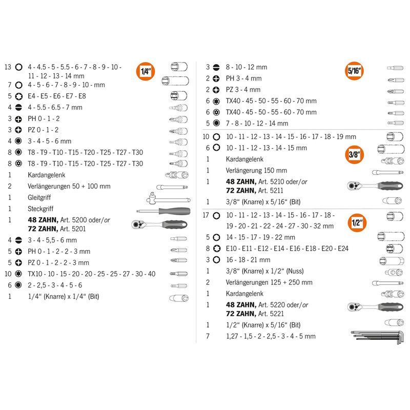 Projahn 1/4" + 3/8" + 1/2" proficraft Satz 182tlg., 72 Zahn Knarren, im Koffer