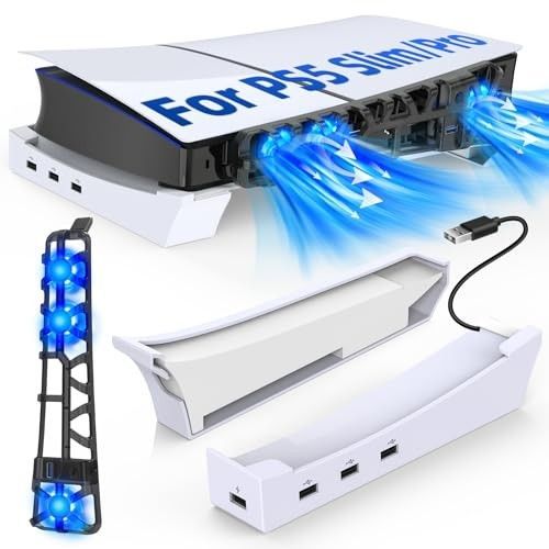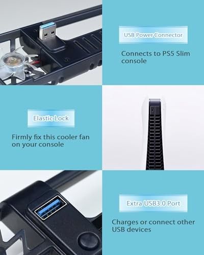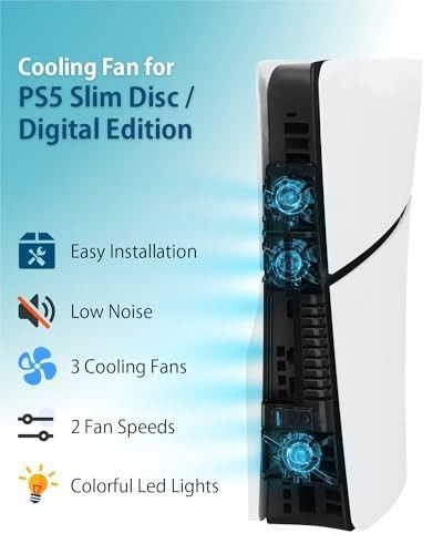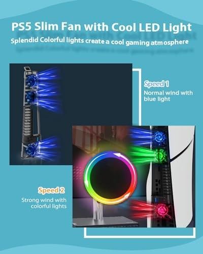 Geeignet für PS5 Slim Disc & Digital 3 Leise Lüfter mit einstellbarer Drehzahl RGB-Lichteffekt für eine dynamische Spielatmosphäre Zusätzlicher USB 3.0 Anschluss für Zubehör Einfache, werkzeuglose Montage