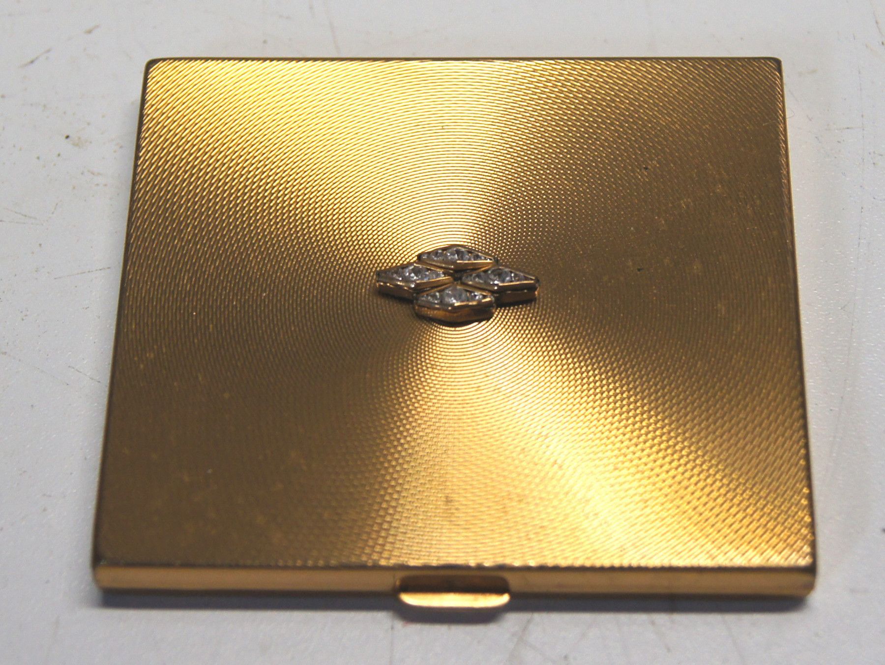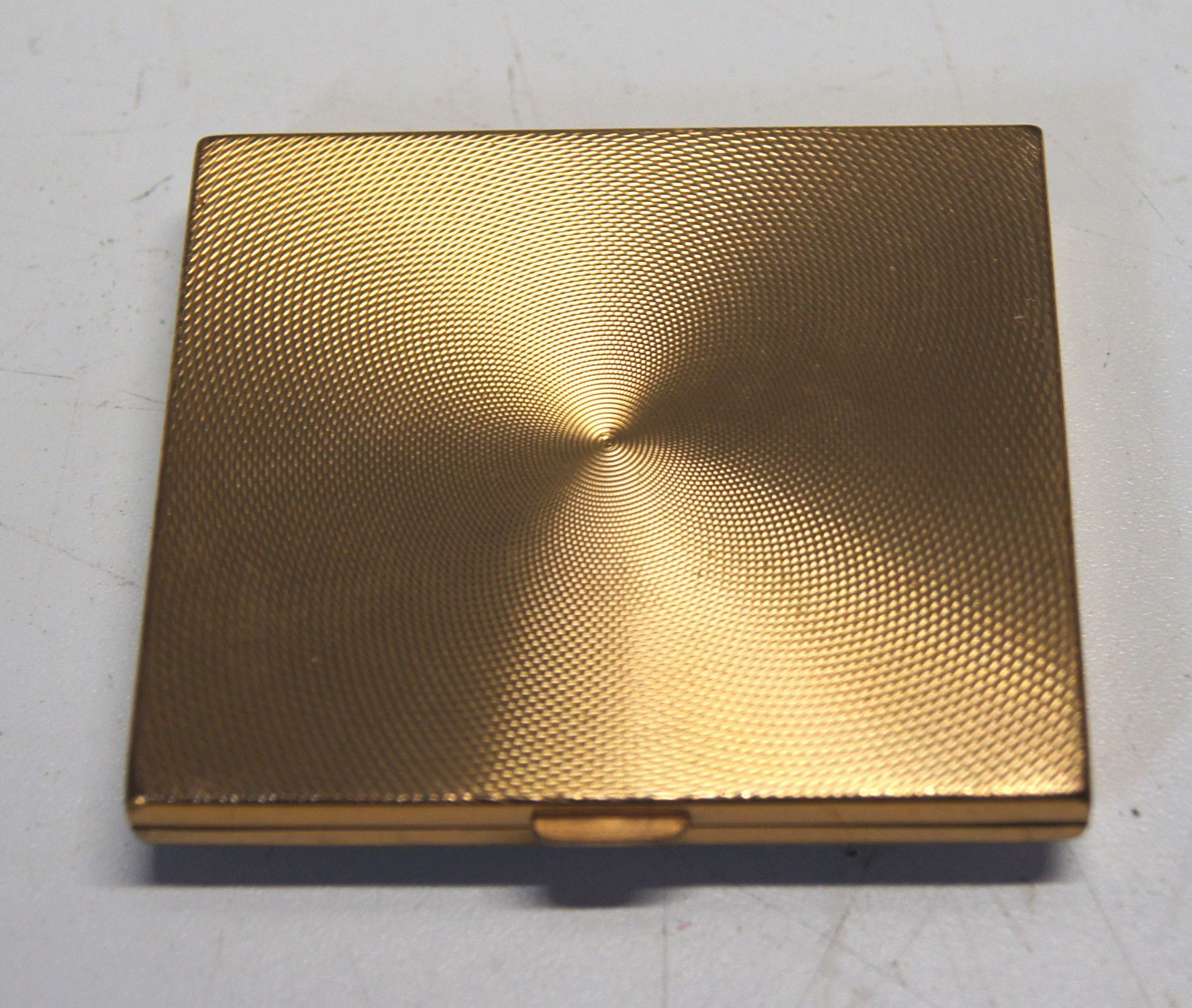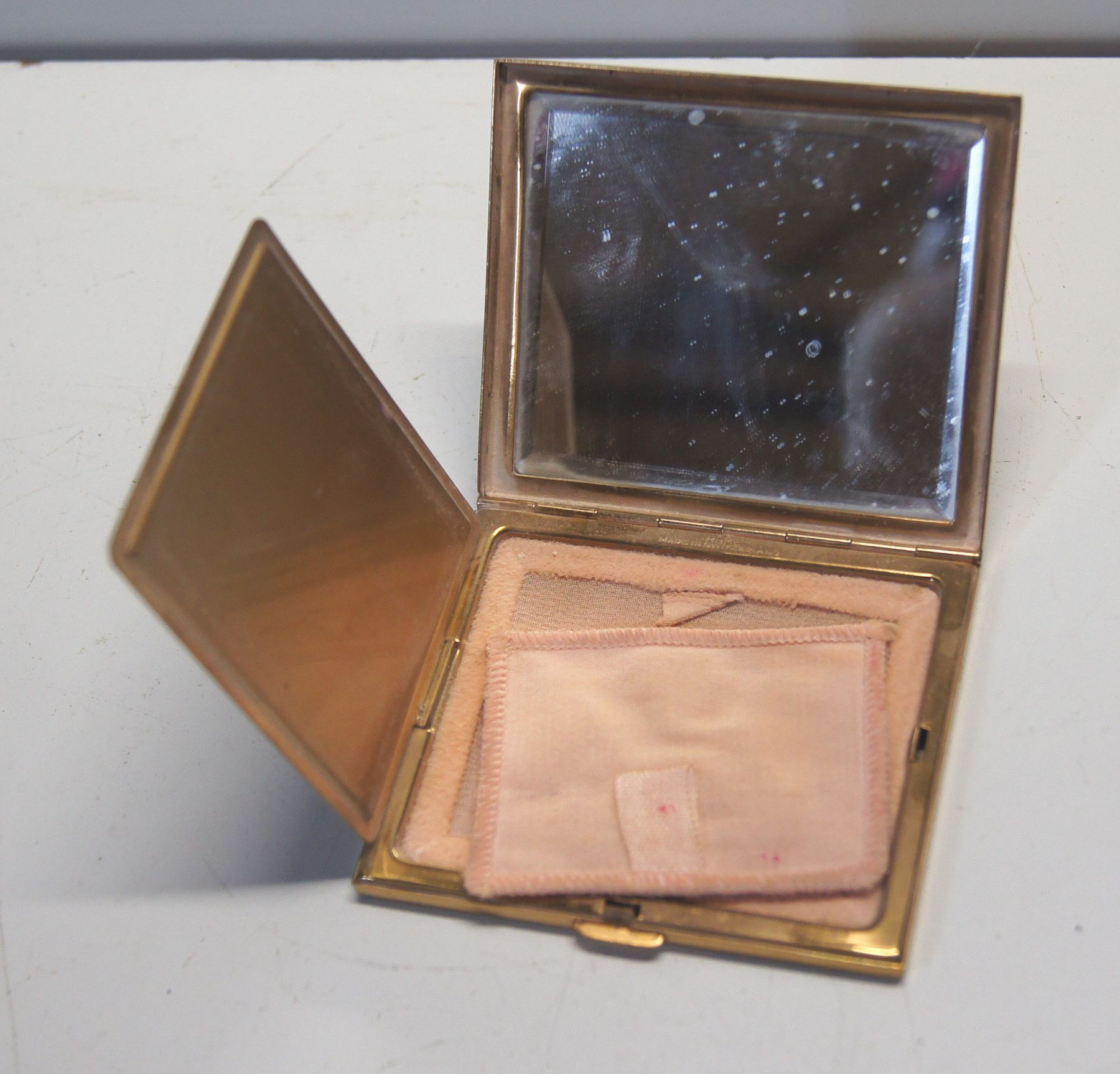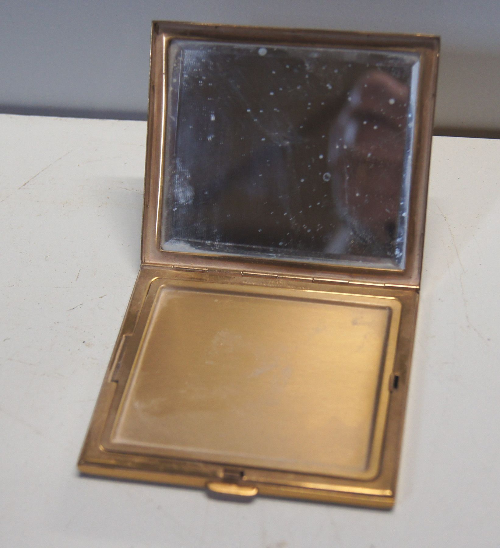Puderdose um 1950. Marke: RBME . Herkunft: Schweiz. Material: Messing vergoldet. Geschliffener Spiegel. Extrem flach! Guter Zustand, aber ungeputzt. Maße: H 0,8, L 7,5, B 6,5 cm. Antikes am Deich - Inh: Oliver kipp-Trense