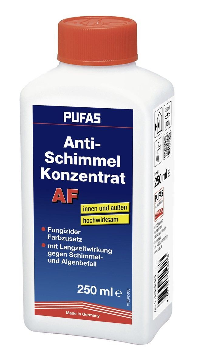 Pufas Anti-Schimmel-Konzentrat AF 0,25 Liter Details für Anti-Schimmel-Konzentrat AF 0,25 Liter: Sanierkonzentrat mit Langzeitwirkung gegen Schimmel und Algen. Schützt wasserbasierte Produkte wie Dispersions-, Latex-, Siliconharz- und Siloxanfarben, Dispersionskleber, Tapetenkleister und Leim vor Sc