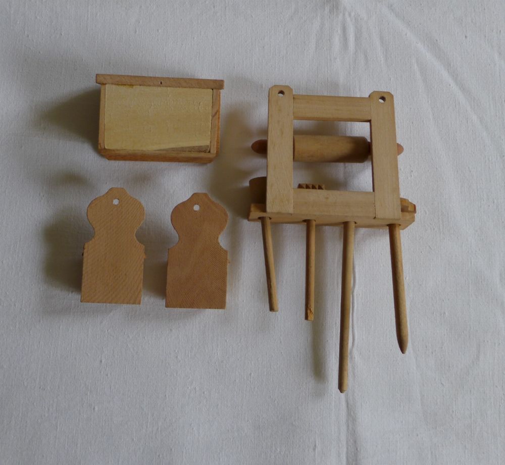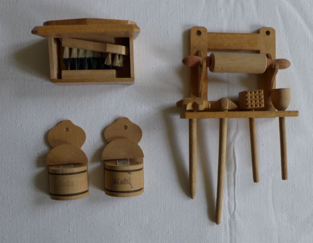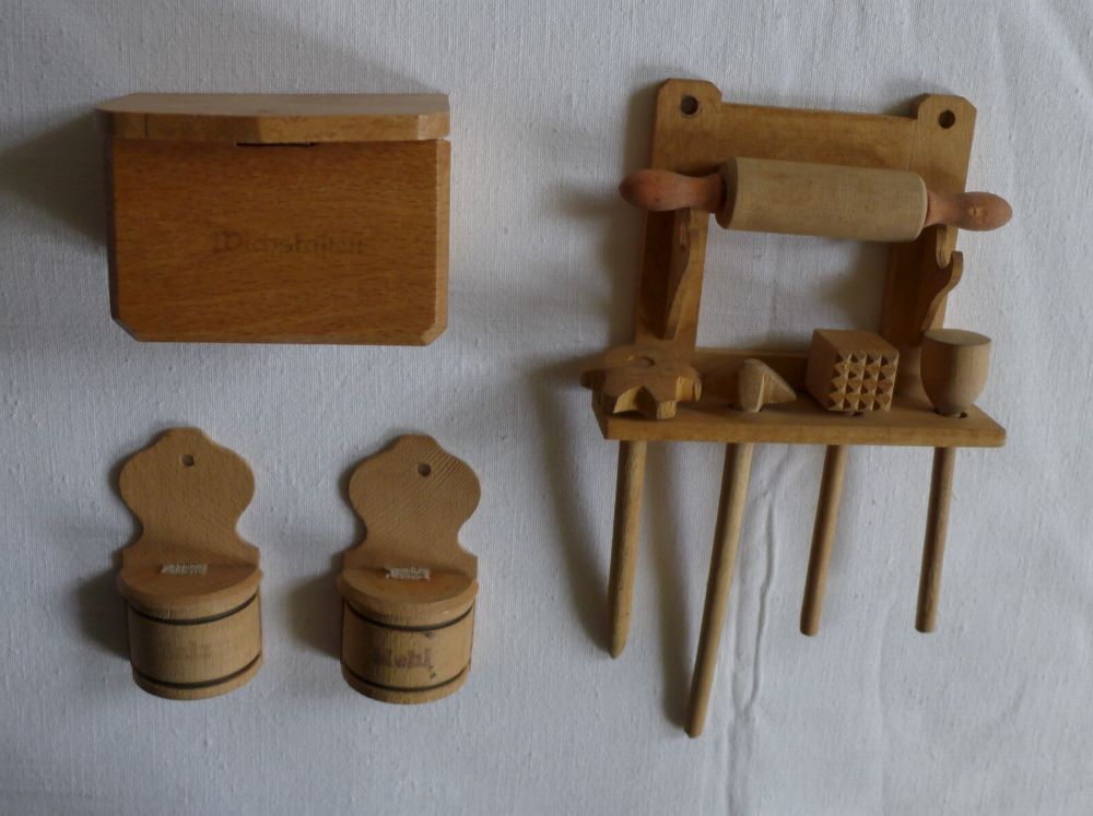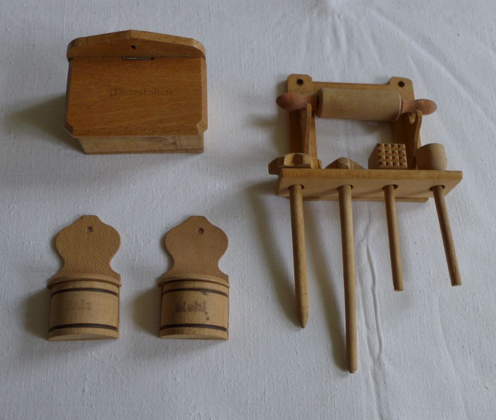 Puppenstube Küche Holz Salz Mehl Wichskasten Quirl Stampfer Nudelholz Fleischklopfer