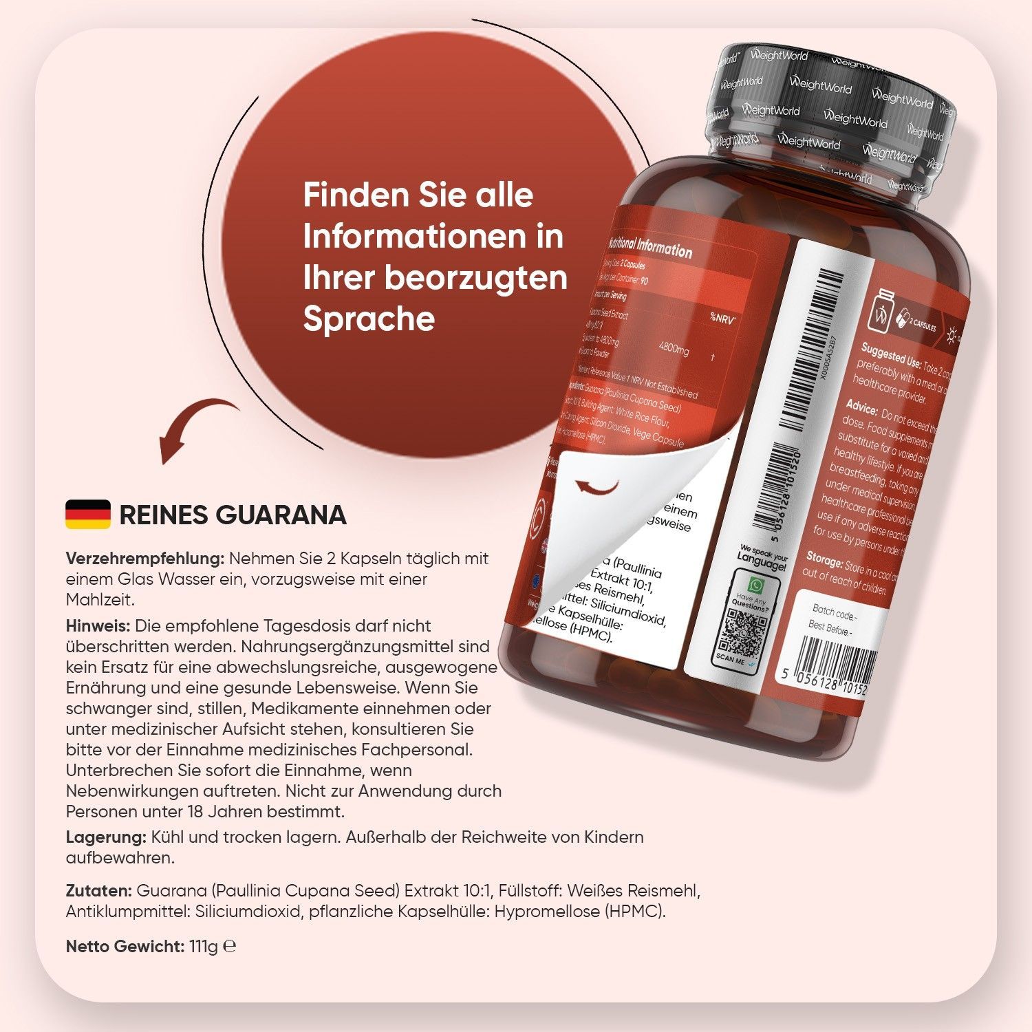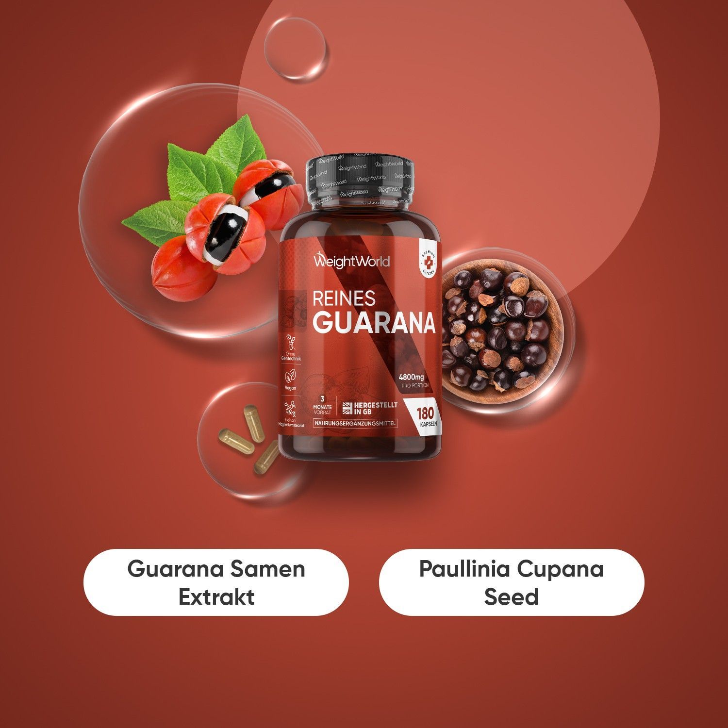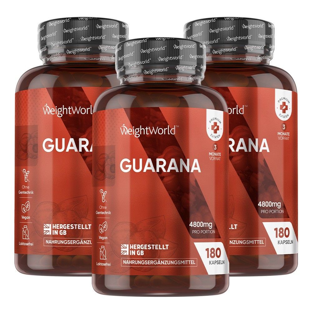 Pure Guarana Kapseln - 4800mg Guarana Pulver pro Portion - 180 Stück- 3 Pack