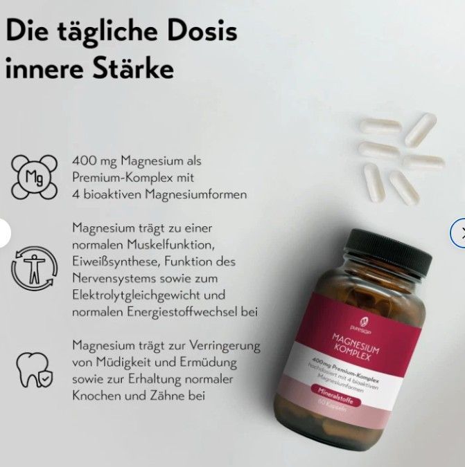 pureSGP Magnesium Komplex - 400 mg reines Premium Magnesium aus 4 hochwertigen Magnesiumformen. Hohe Bioverfügbarkeit. Labor geprüft, hochdosiert. Vegan Info zu diesem Artikel 4 BIOAKTIVE MAGNESIUM-FORMEN: Kapseln mit perfekt aufeinander abgestimmten Magnesium-Verbindungen: Magnesium-Citrat, Magnesi