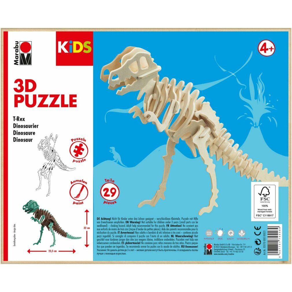 Marabu Puzzle Holz 3D KiDS Dinosaurier 29Teile zum Ausmalen