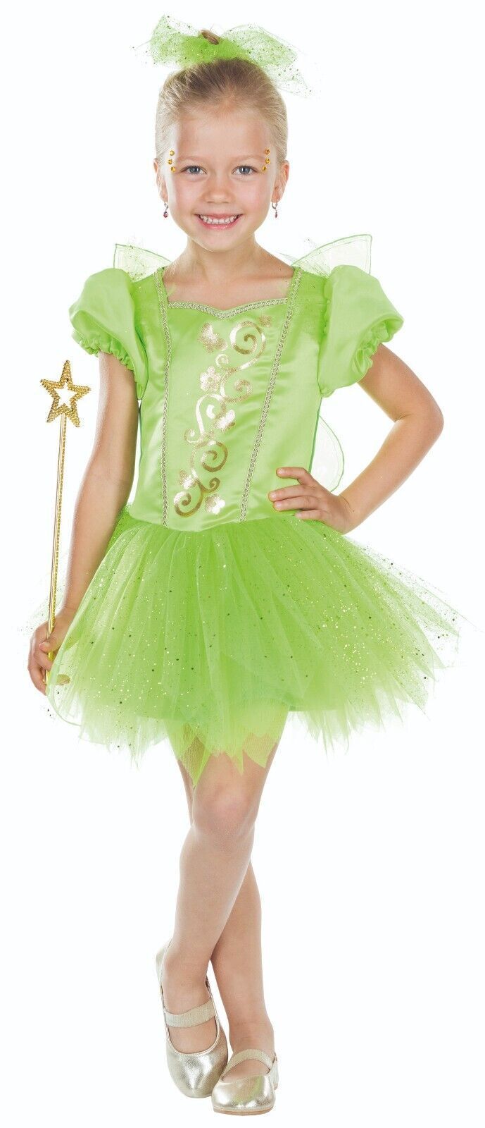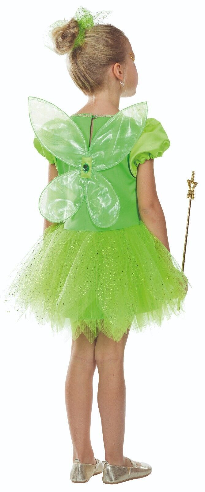 Hellgrünes Kleid mit kurzen Puffärmeln, das auf dem Oberteil mit einem goldenen Ornamentdruck und Borte verziert ist. Über dem kurzen Rock ist ein Überrock aus glitzerndem Tüll drapiert. Inklusive glänzender Feenflügel, die mit Klettverschluss am Rücken befestigt werden können. Größen: 104 - 140 Bei