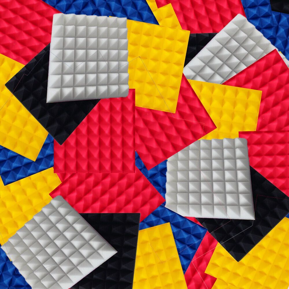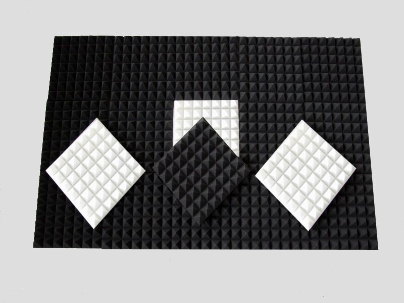 Schallschutz, Technische Akustik und Raumakustik Pyramiden Noppenschaum Königspyramiden Absorber PUR-Kleber Pyramiden Minis Farben: Anthrazit dunkel Grau*, Weiß, Blau, Rot, Gelb Maße ca. 25x25x5cm Normal oder FSE* (Brandschutz) *alle hellen Schaumstoffe unterliegen dem Lichalterungsprozess (vergilbe