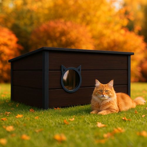 QLS QLS Isoliertes Katzenhaus aus Holz 73×52×38 cm Vorhang Wetterfest Dunkelbraun 11392