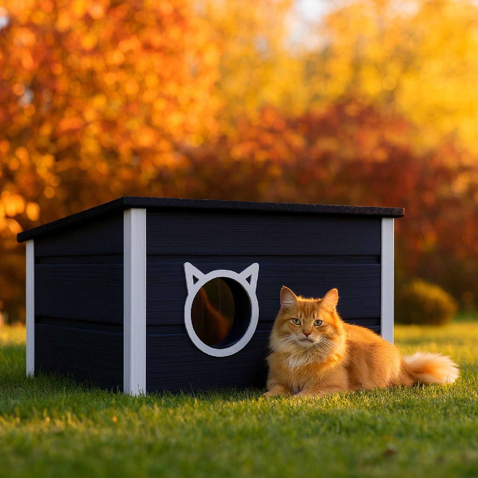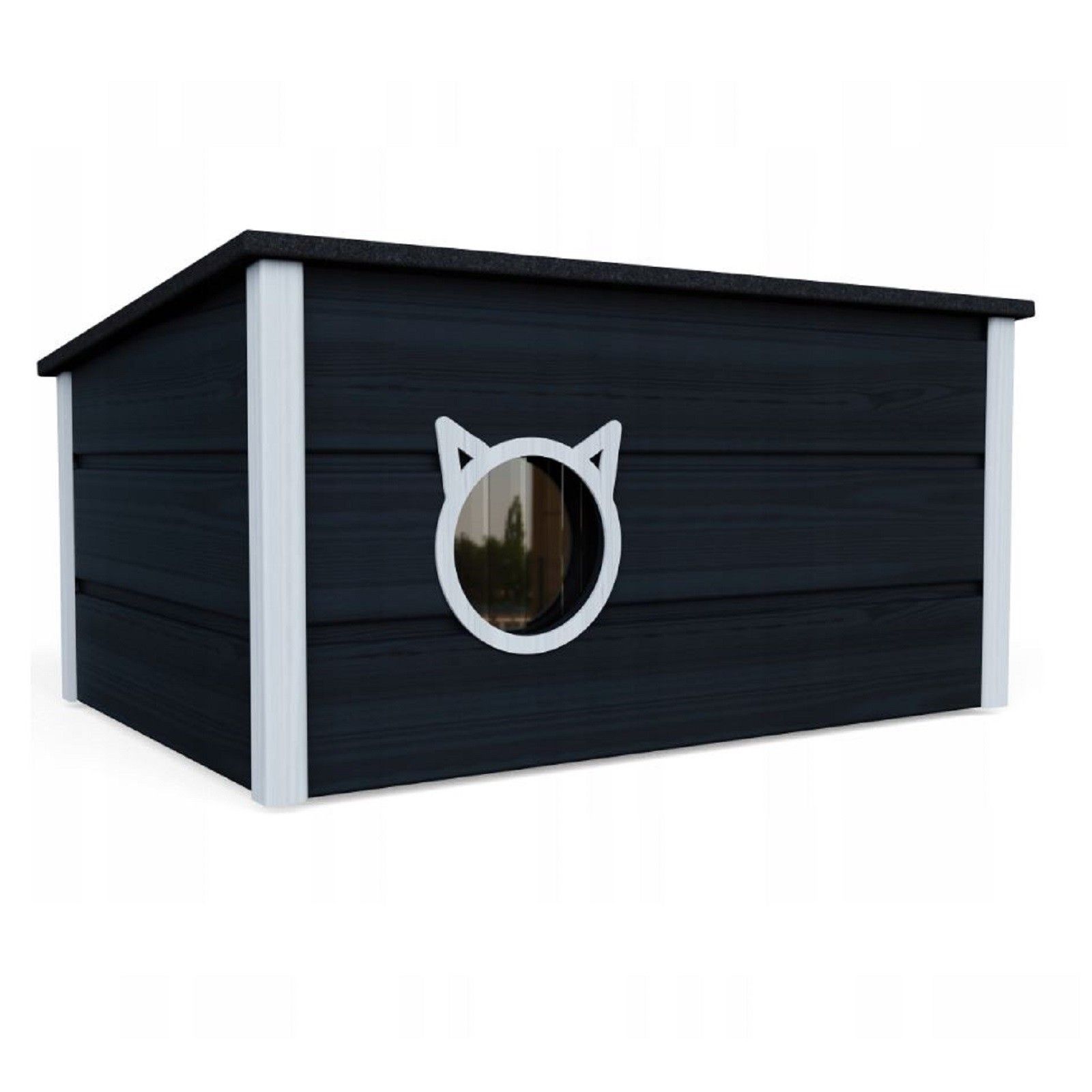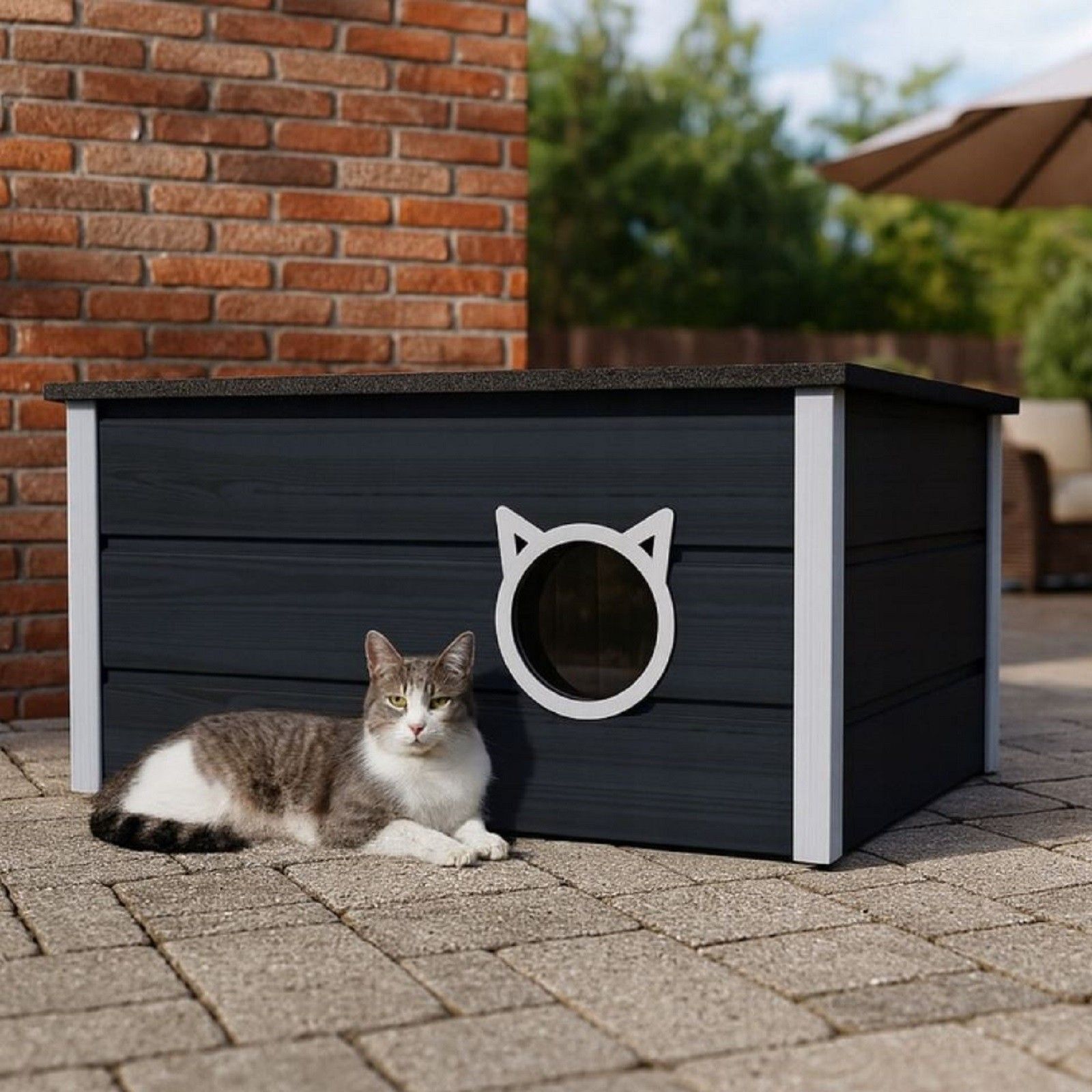 QLS QLS Isoliertes Katzenhaus aus Holz 73×52×38cm mit Vorhang Wetterfest Dunkelgrau 11388