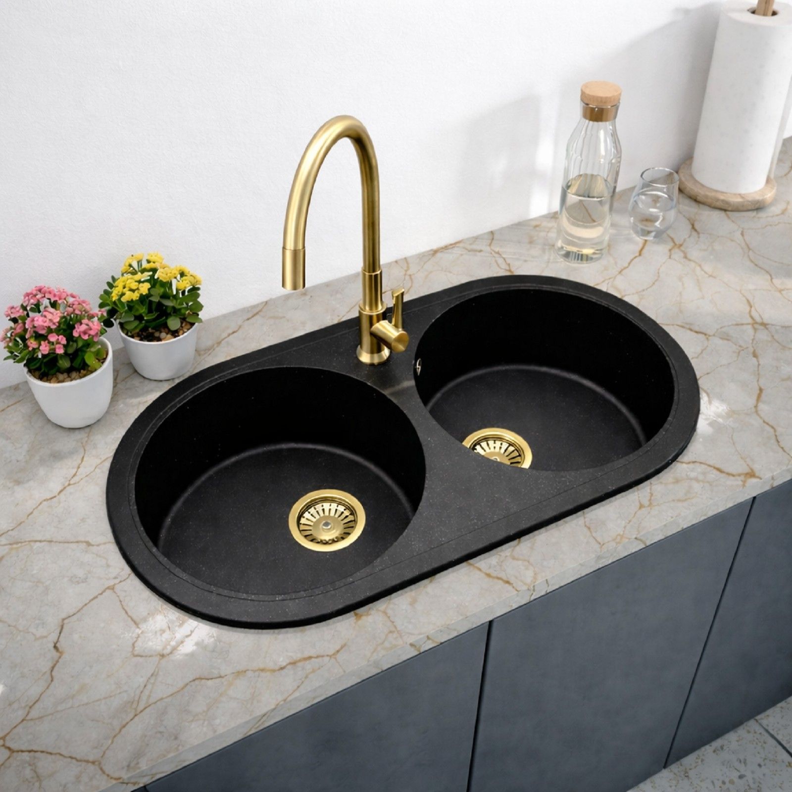 QLS QLS Manueller Siphon 3 1/2 Zoll Ablauf für Doppelbecken Gold Edelstahl PVC 11438