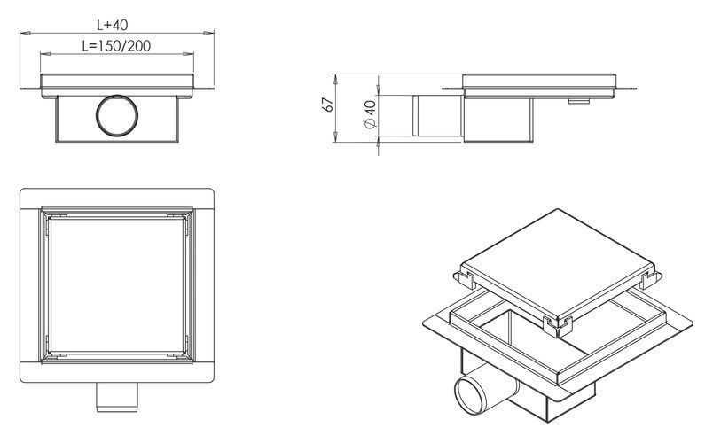 Quadrat Duschrinnen Edelstahl SQ-DRAIN 15x15 cm in Silber, Abfluss Befliesbar 2in1