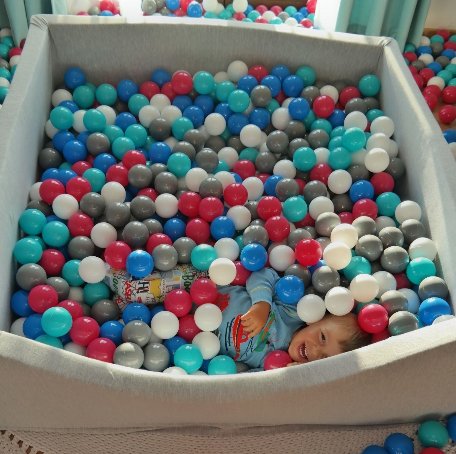 Quadratisches Bällebad 120x120 cm mit 900 Bällen weiß, grau & türkis