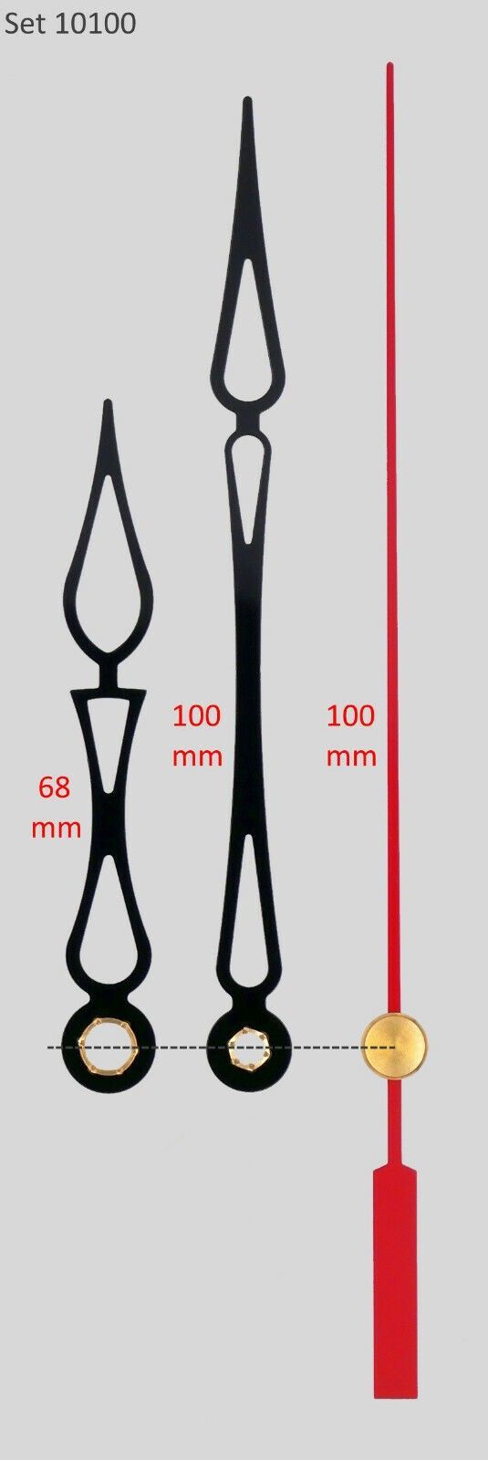 Quarz Uhrwerk + Zeigersatz (3-Zeiger-Set) Uhrwerke: für Zifferblattdicke 1 - 21 mm ohne ticken, lautlos Zeiger aus Aluminium, Farbe schwarz, glänzend Sekundenzeiger: rot Beschreibung Zeigersatz Aluminium glänzend hohe Qualität mit Schutzfolie - Sekundenzeiger: 100 mm - Minutenzeiger: 100 mm - Stunde