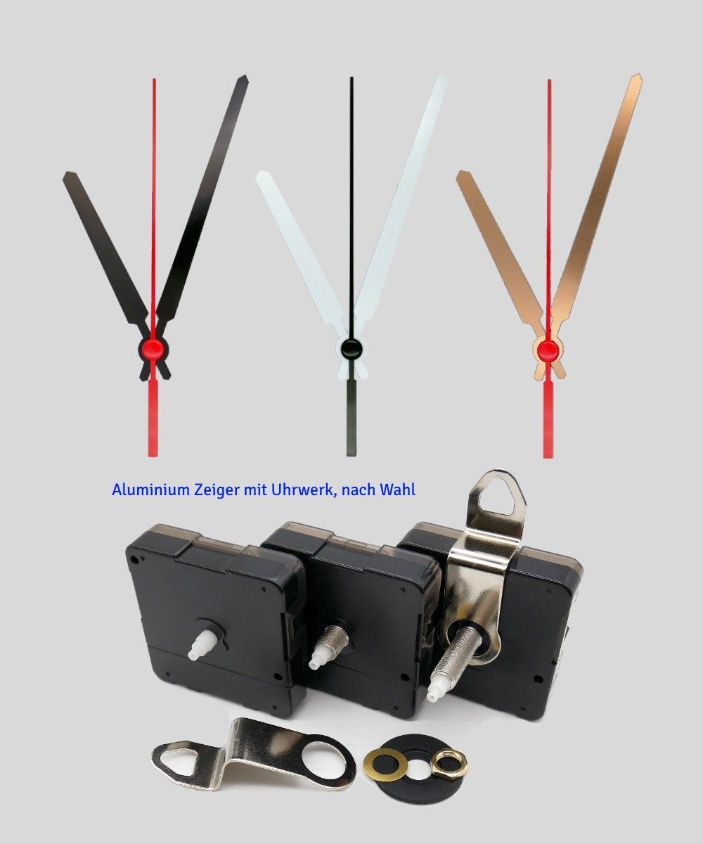 Quarz Uhrwerk lautlos mit Zeigersatz 95 mm Alu 10cm schwarz weiß gold f. Wanduhr