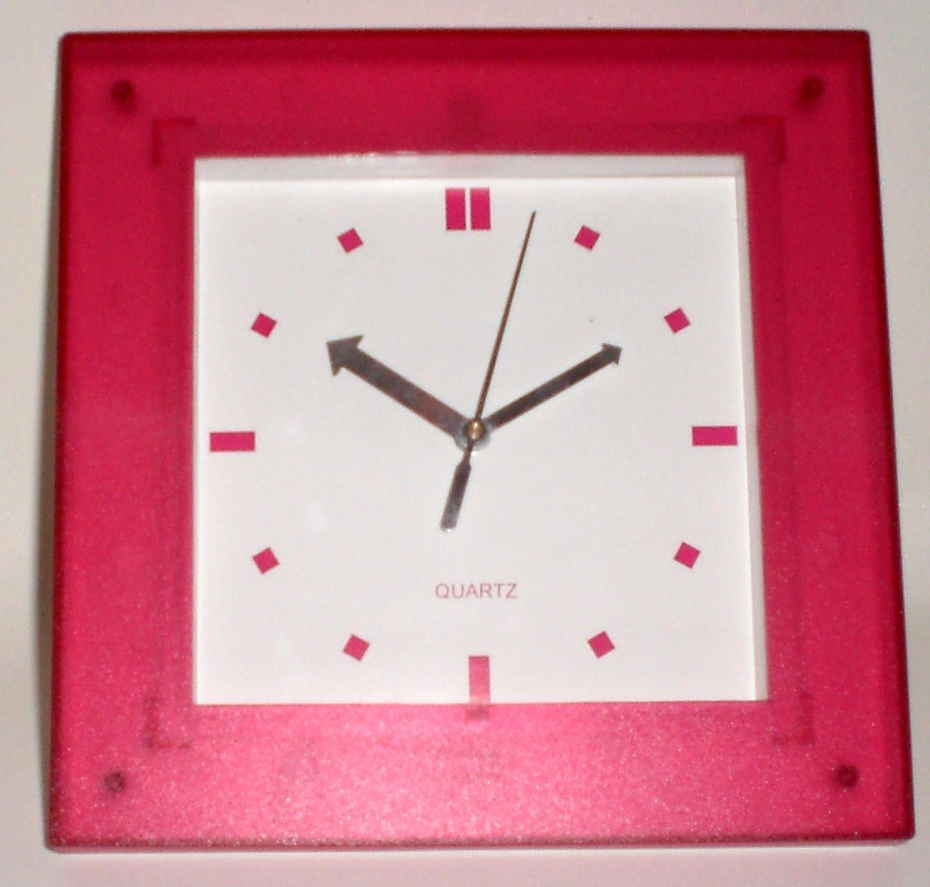 Diese 19,5 x 19,5 cm große Quartz Uhr besticht durch ihre Schlichtheit. Umrandet wird diese Uhr mit einem 3 cm breiten Kunststoff-Rahmen im schönen rosafarbenen Ton. Die Zeiger erscheinen in silberglänzenden Metall-Look. Neben dem Stunden- und Minutenzeiger, dessen Enden als Pfeil gearbeitet sind, b