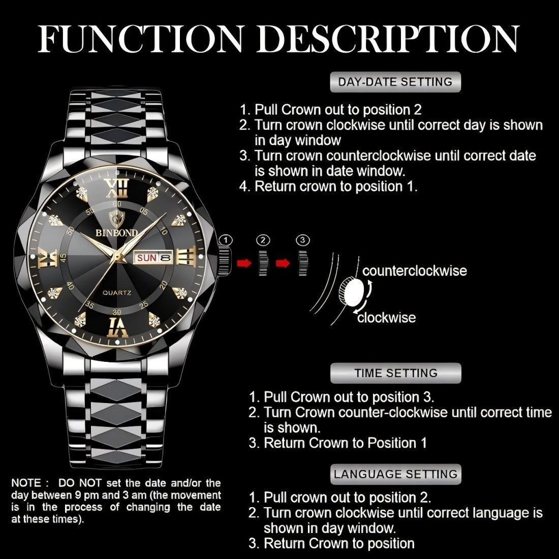 Edelstahl Armbanduhr, Große Zahlen Ziffern 3Bar Wasserdicht Datum Analog
