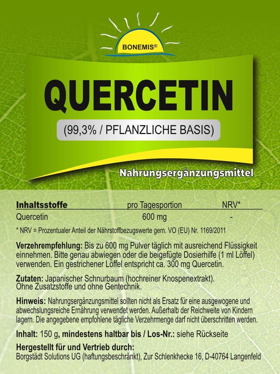 Quercetin, hochrein (99,3%, pflanzliche Basis) ohne Zusätze, 150 Gramm, Bonemis®