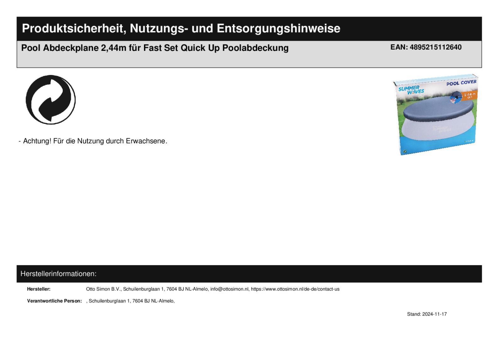 Quick Up Poolabdeckung für 2,44m Pool Schutzplane Abdeckplane Poolplane rund