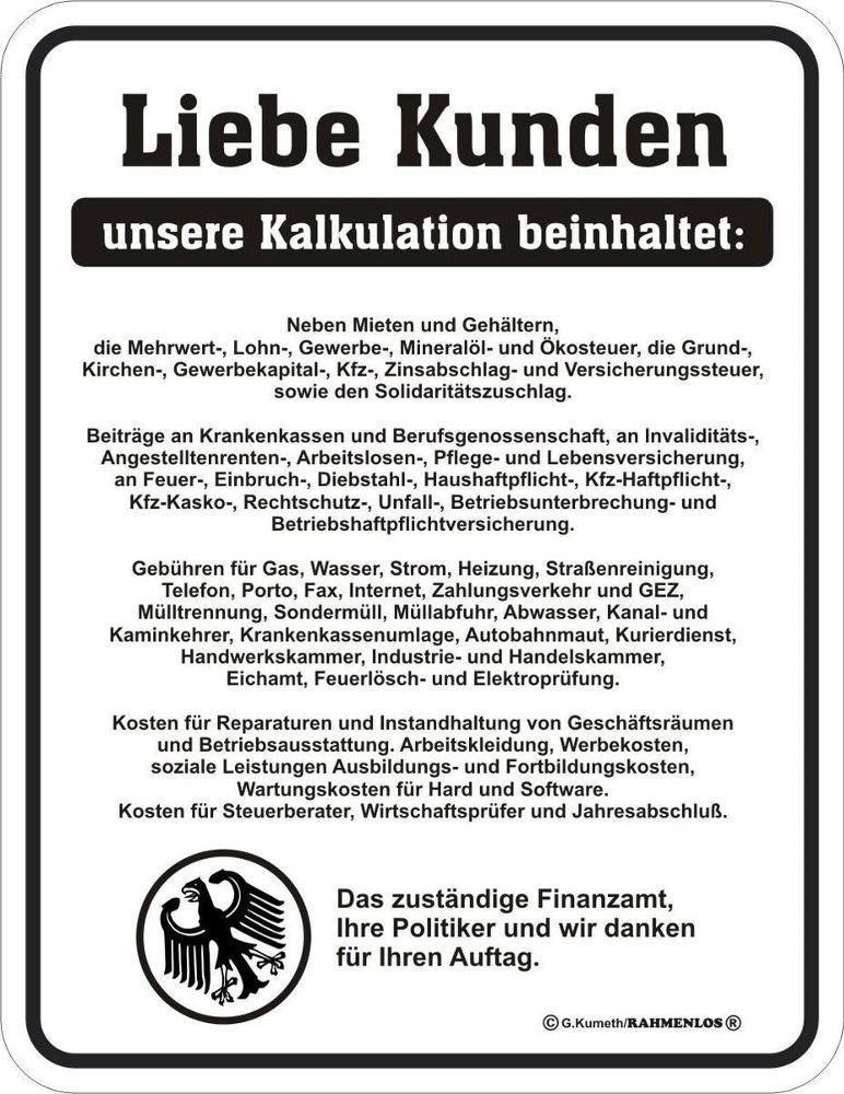 Rahmenlos Rahmenlos® Blechschild 17 x 22, unsere Kalkulation, Werbeschild Art. 3569
