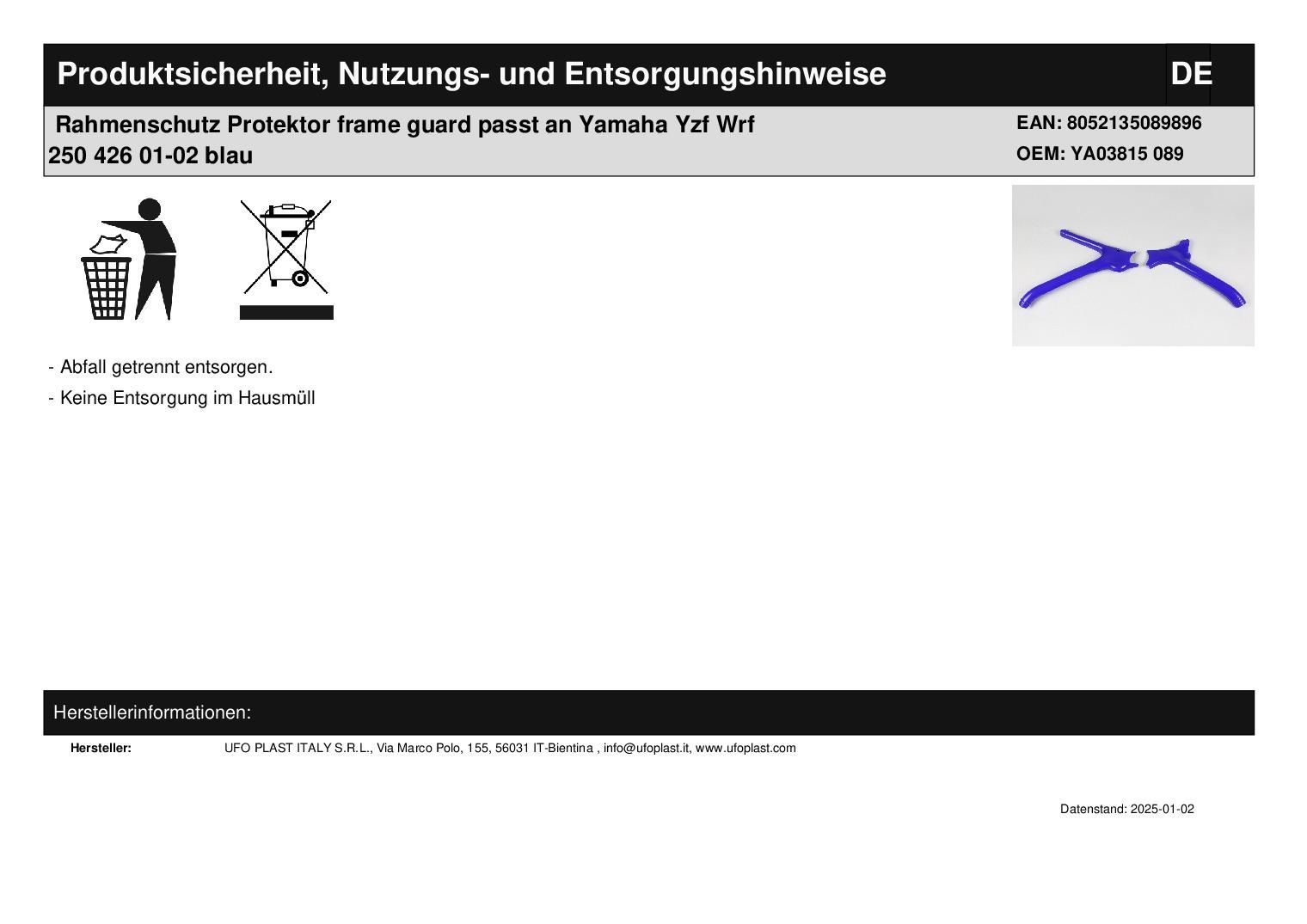 Rahmenschutz Protektor frame guard passt an Yamaha Yzf Wrf 250 426 01-02 blau