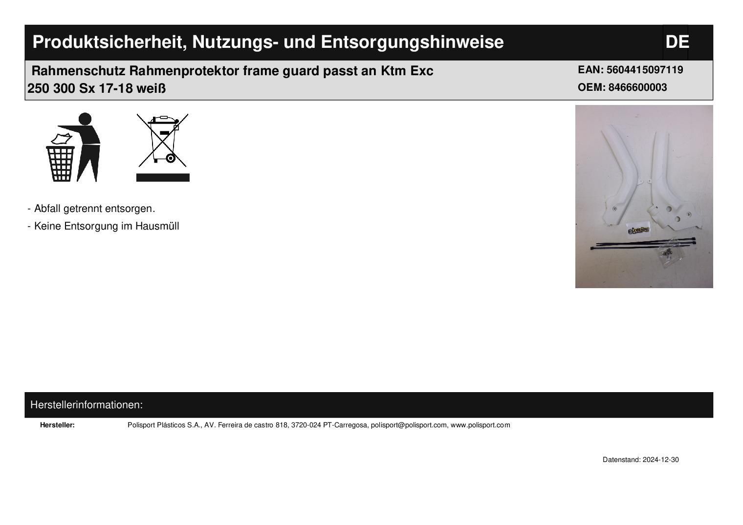 Polisport Rahmenschutz Rahmenprotektor frame guard passt an Ktm Exc 250 300 Sx 17-18 weiß