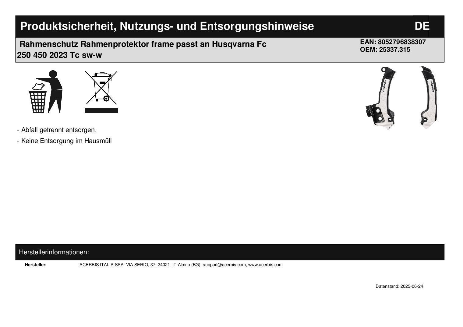 Acerbis Rahmenschutz Rahmenprotektor frame passt an Husqvarna Fc 250 450 2023 Tc sw-w